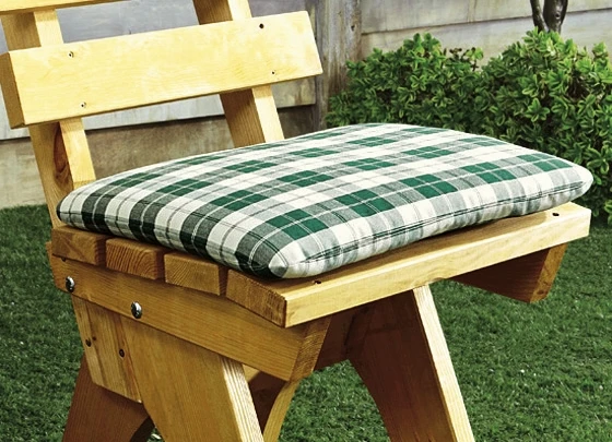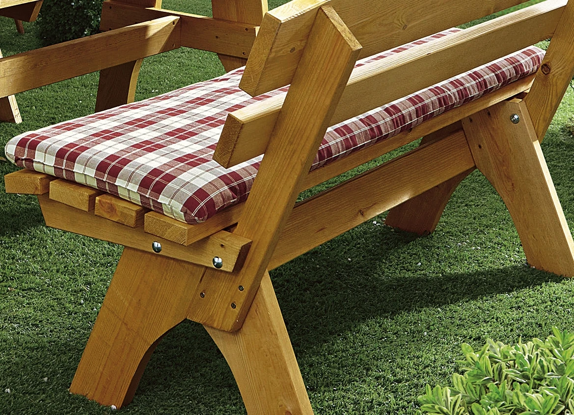 Auflagen mit vliesummantelter Schaumstoff-Platte. Bezug aus 50% Baumwolle und 50% Polyester.