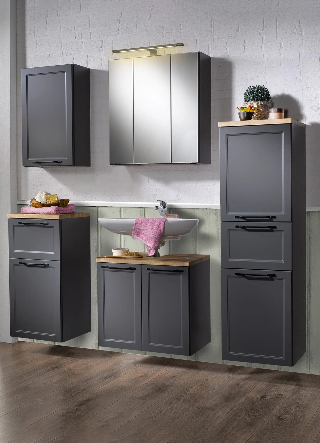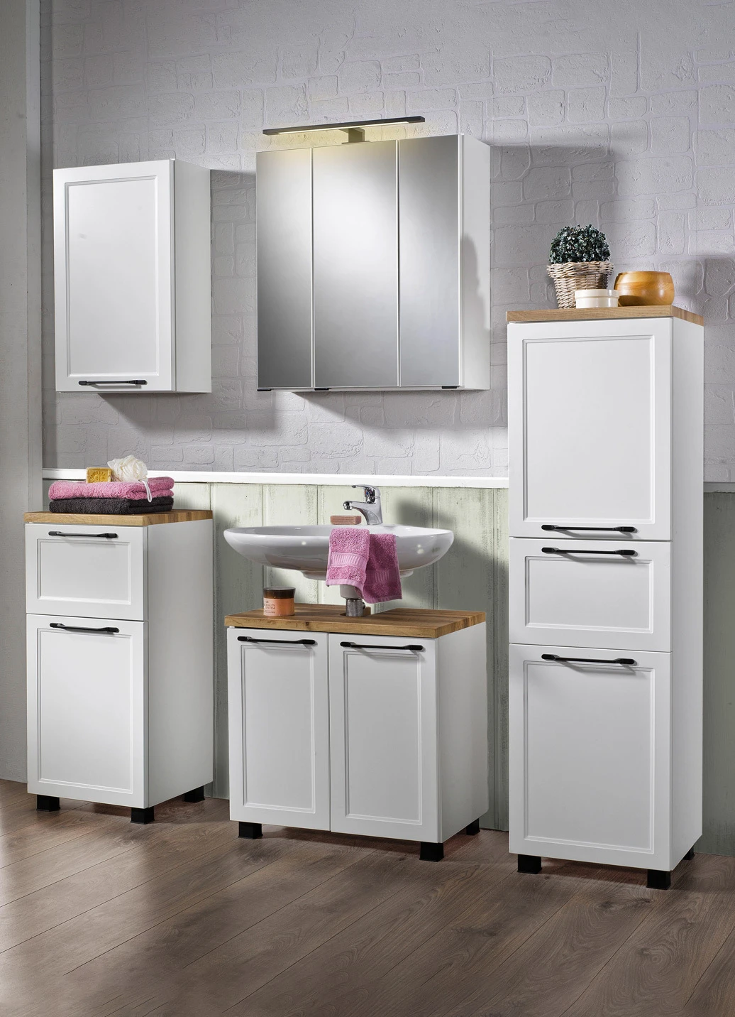 Badmöbel-Programm mit profilierten und pflegeleichten MDF-Fronten