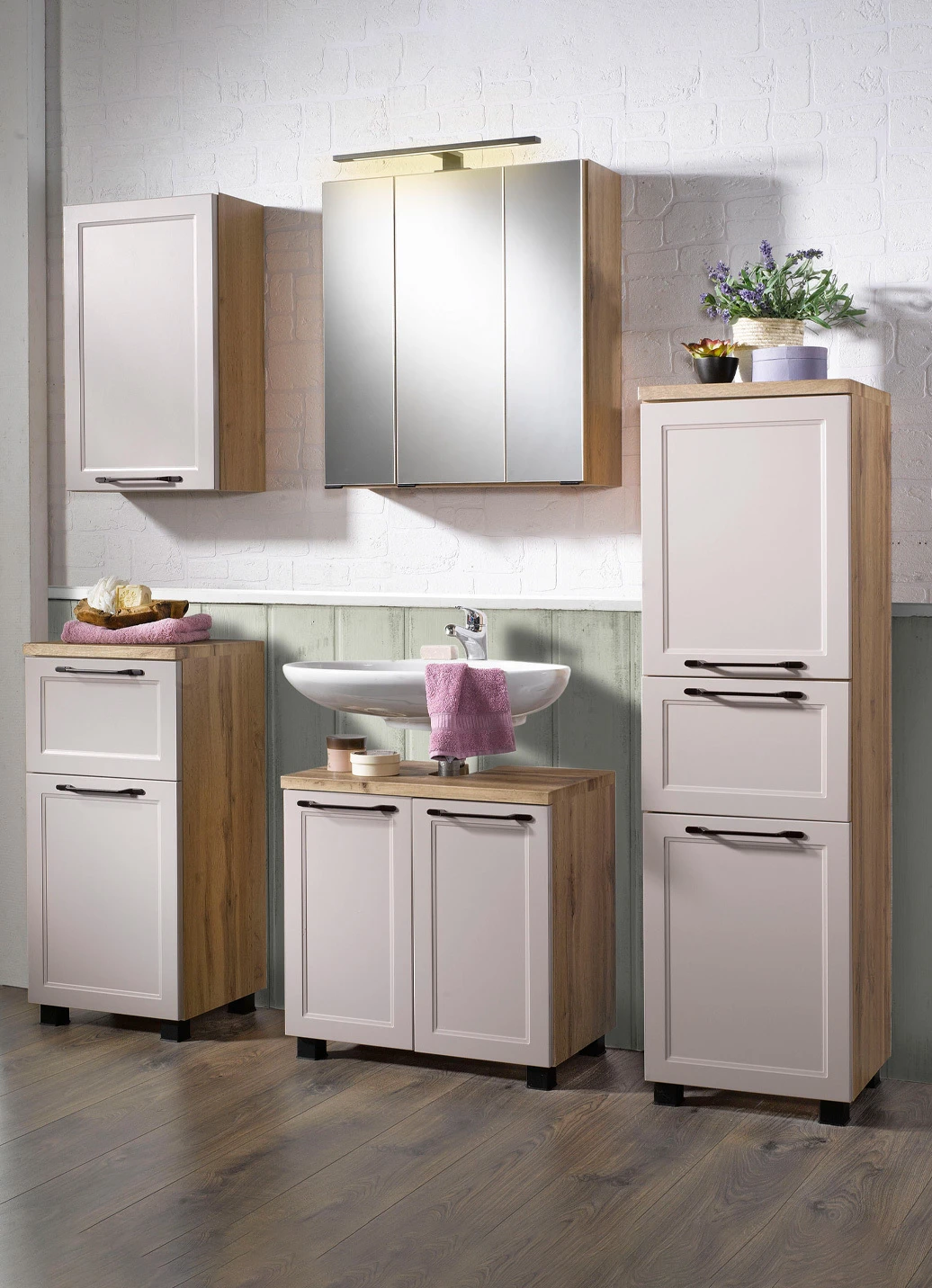 Tolles Badmöbel-Programm mit modernen, profilierten und pflegeleichten MDF-Fronten. Schubladen auf Metallauszug mit Softclose-Funktion, Türen mit Dämpfung. Mit Melaminharzbeschichtung, Bügelgriffen aus schwarz lackiertem Metall. Türanschlag rechts und links möglich. Aufstellung wahlweise stehend oder an der Wand hängend. Korpus eiche, Fronten beige. Mit Aufbau-Anleitung.