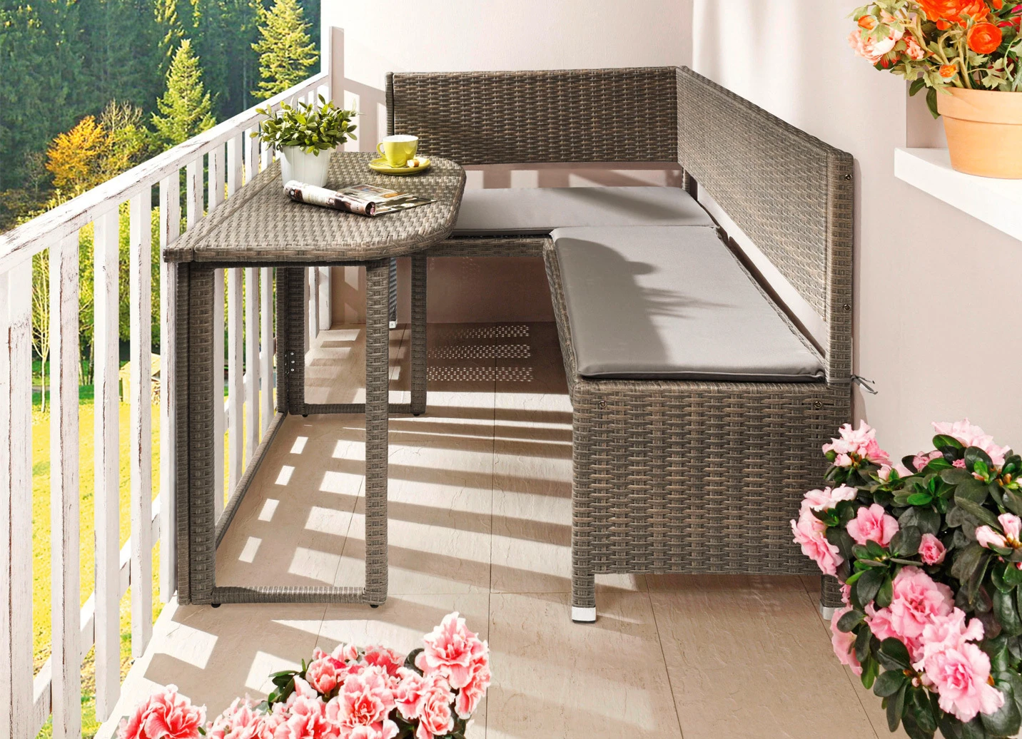 So lässt sich Ihr Balkon tatsächlich bis in die hinterste Ecke optimal ausnutzen! Die Tischplatte lässt sich bei Bedarf einfach einklappen. Bank auch spiegelverkehrt montierbar. Inkl. Sitzkissen (100% Polyester). Mit Aufbau-Anleitung.