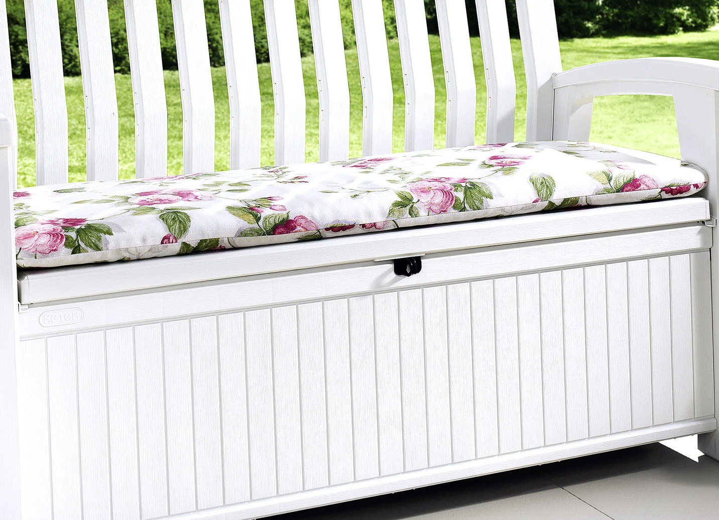 Bankauflage mit Bezug aus 75% Baumwolle und 25% Polyester sowie 6 cm starker, vliesummantelter Schaumstoffplatte.