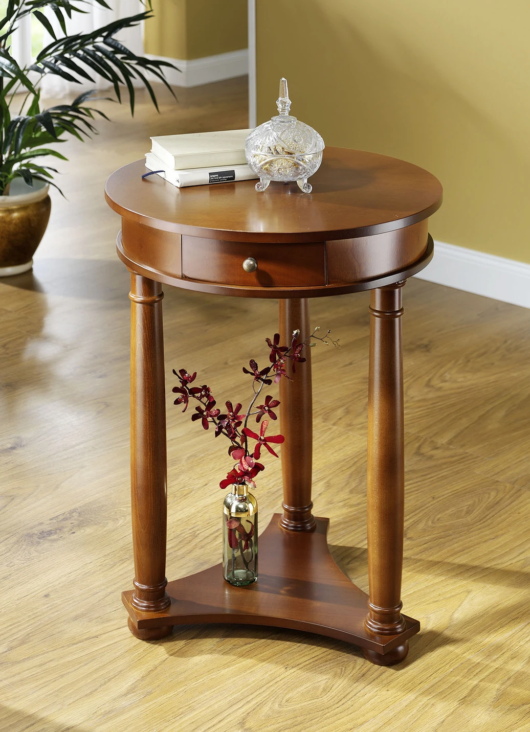 Raffinierter, runder, teilmassiver Beistelltisch in Nussbaum mit Echtholzfunier, mit Metallknopf an der praktischen Schublade, 1 Ablage unten sowie schön gedrechselten Beinen aus massivem Buchenholz. Maße: Höhe 68 cm, ø 50 cm. Die Lieferung erfolgt aufgebaut