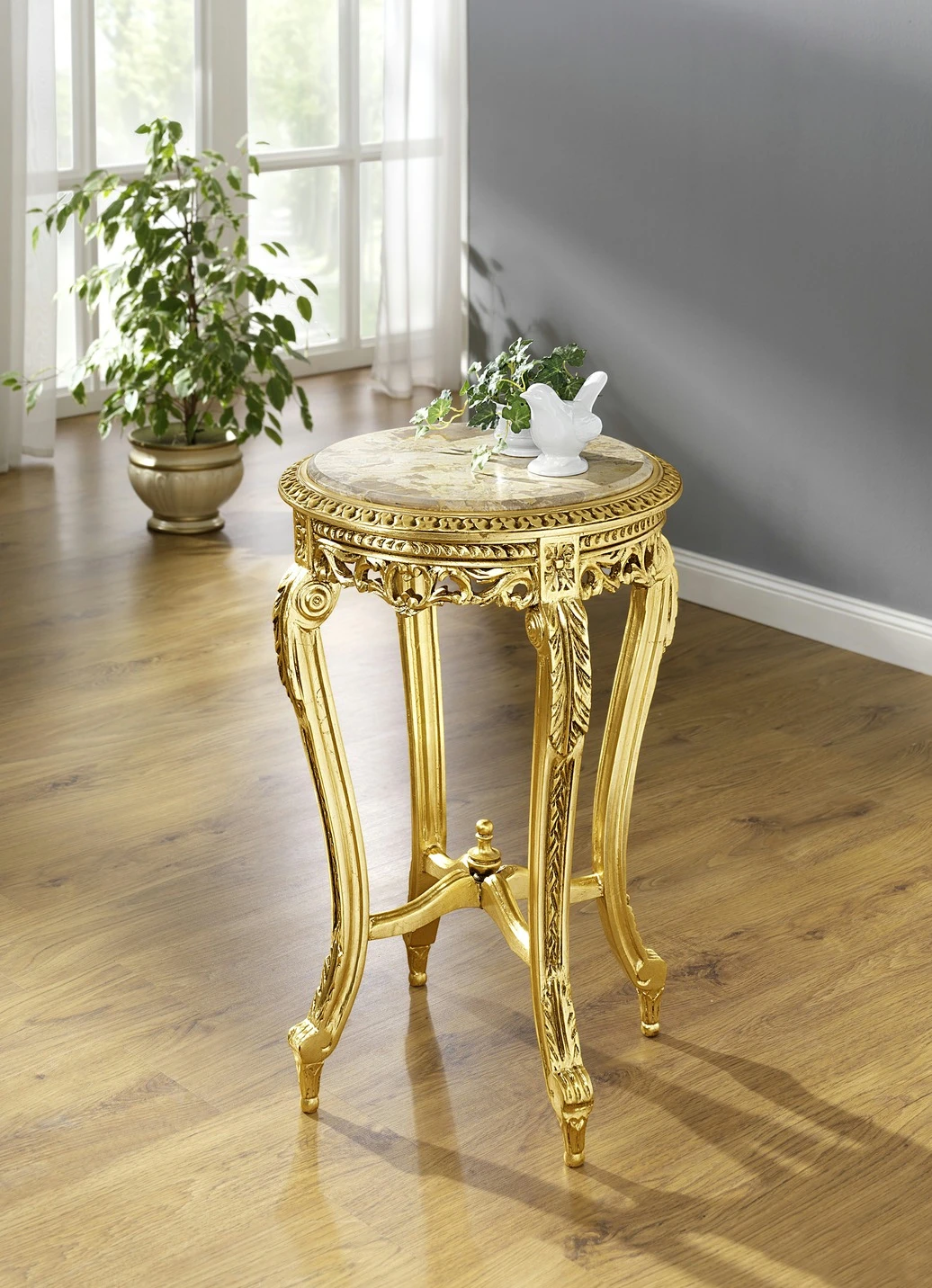 Zauberhafter Beistelltisch mit detailverliebten Verzierungen, echter Blattgoldauflage und Marmorplatte. Die Lieferung erfolgt aufgebaut
