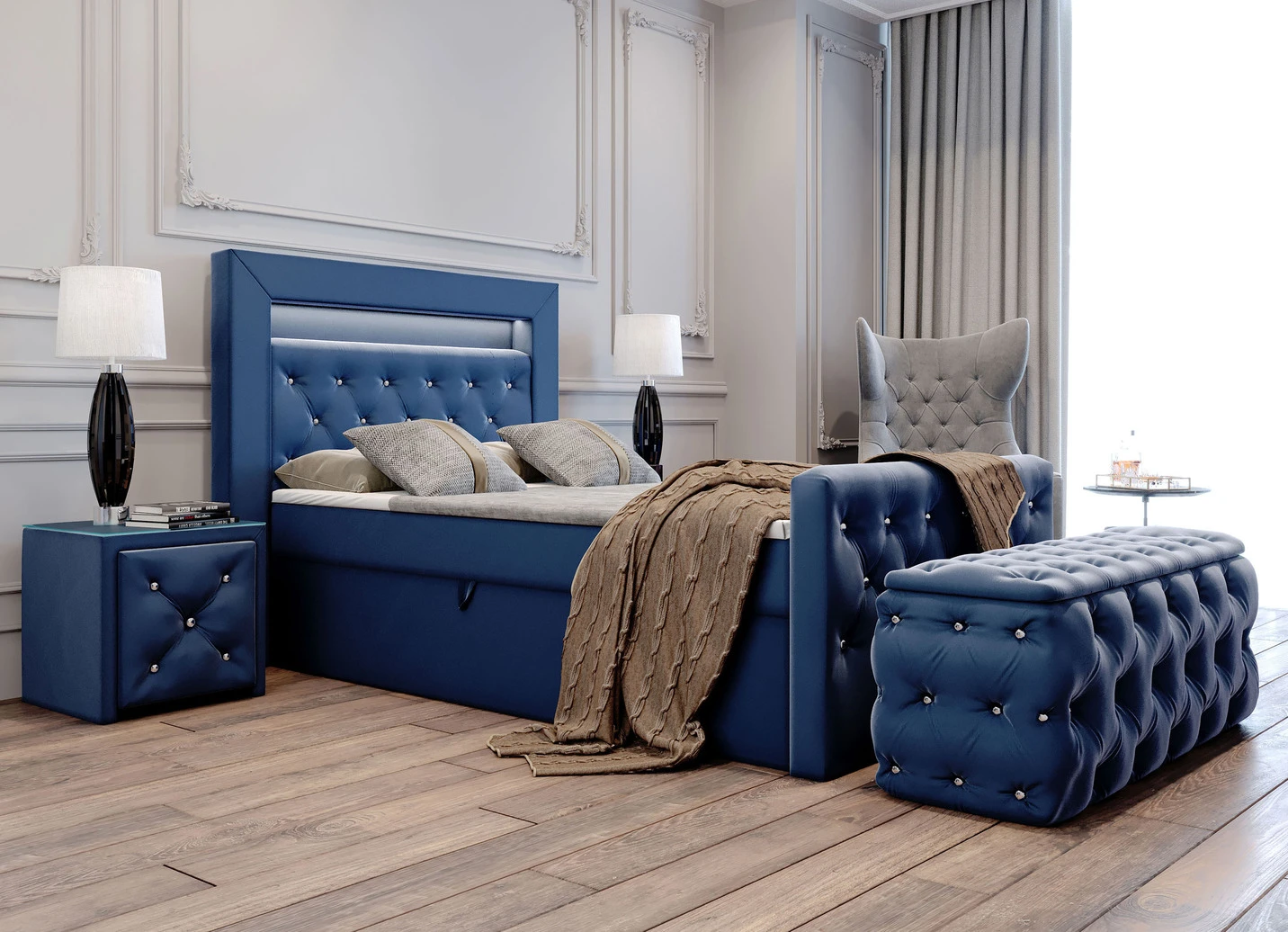 Boxspringbett mit LED-Beleuchtung, Topper und Nachttisch mit einer Liegefläche von 120/200 cm und in Dunkelblau.