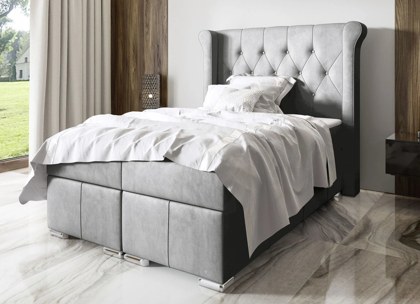 Ein völlig neues Schlaferlebnis werden Sie mit diesem hervorragenden Boxspringbett mit elegantem Stoffbezug aus Samt (100% Polyester) genießen! Mit schmuckhaften Knöpfen am markant gerundeten Kopfteil gefertigt und 2 praktischen Bettkästen (seitlich zu öffnen) mit viel Stauraum ausgestattet. Die Box besteht aus einem hochwertigen Echtholzgestell und besitzt einen Tonnentaschenfederkern (20 cm), der für hohen Schlafkomfort sorgt! Belastbar bis 120 kg Körpergewicht je Bettseite.