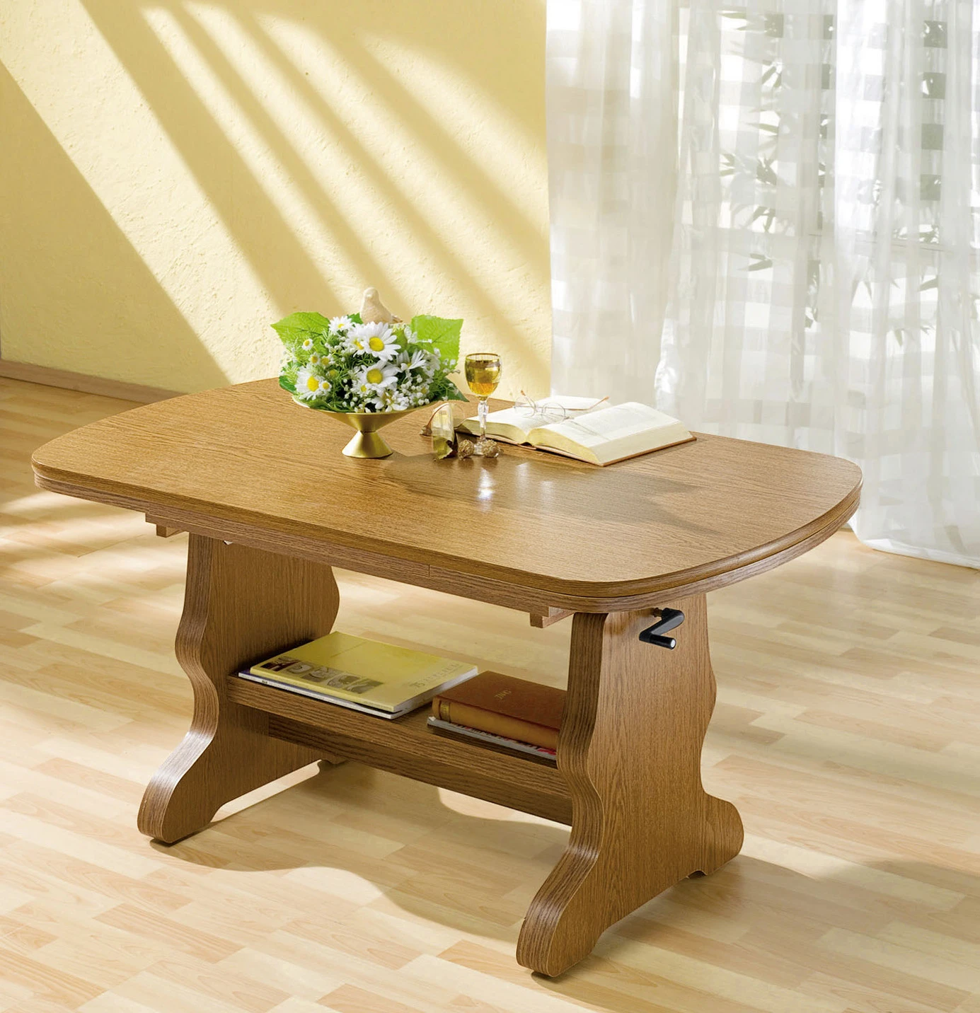 Couchtisch mit melaminbeschichteter Oberfläche in der Ausführung Feste Platte und in Eiche Rustikal.