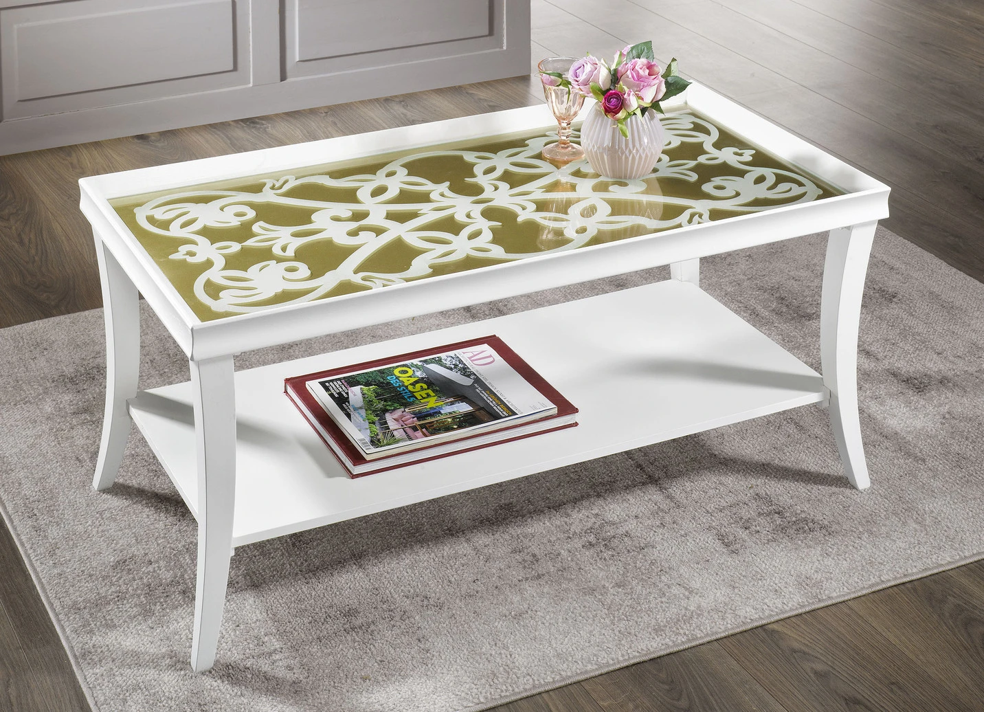Couchtisch mit Rankenmuster auf der Glas-Tischplatte in Creme-Gold.