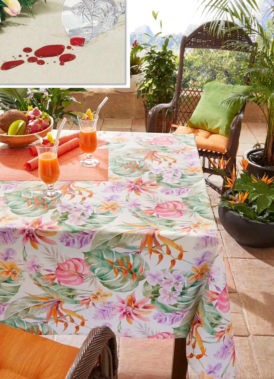 Schick und trendig! Verschönern Sie mit dieser pflegeleichten und digitalbedruckten Tischdecke mit schmalem Saum Ihren Wohnbereich im Garten oder im Haus. Die frische Dessinierung verwandelt Ihren Tisch in ein florales Farbenmeer. Die hochwertige Fleckschutzausrüstung schützt vor Verschmutzungen, die sich zudem ganz einfach mit einem feuchten Tuch entfernen lassen. Waschbar bis 40 °C. Das anschließende Bügeln frischt die Beschichtung wieder auf. Qualität: 100% Baumwolle