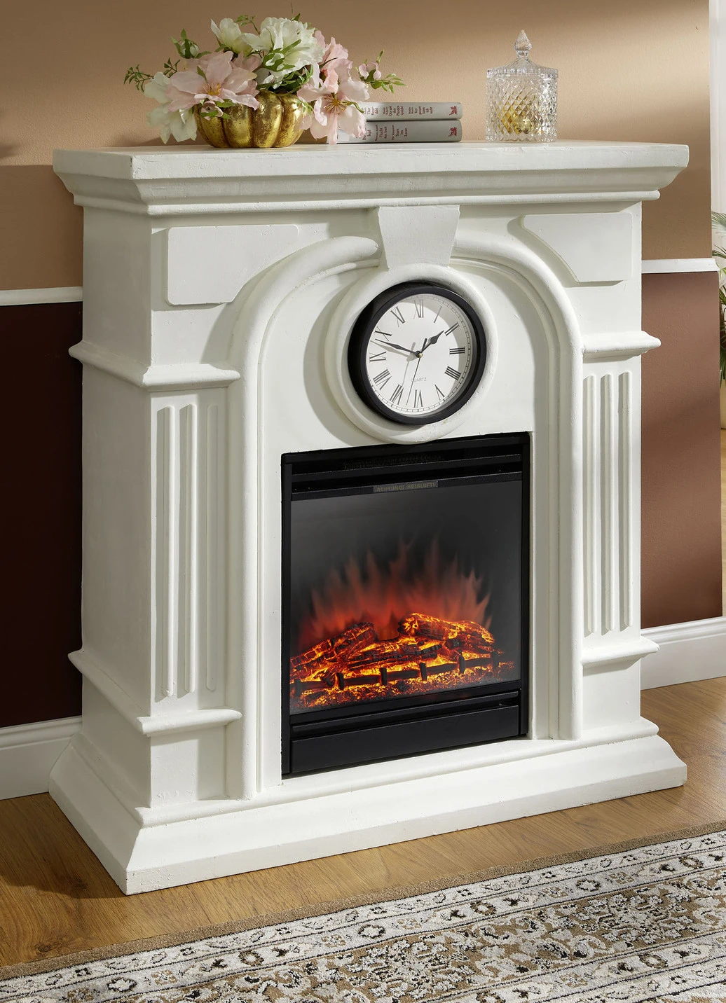 Elektrischer Kamin mit integrierter Uhr in Weiss-Schwarz.
