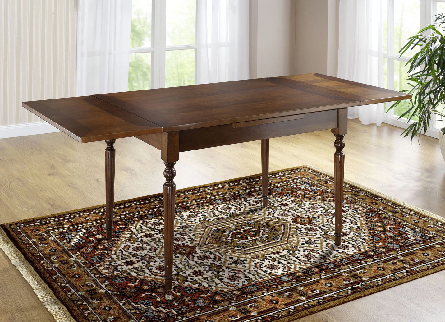 Klassischer Esstisch mit Auszug mit dezenten Charme! Aus nussbaumfarbenem, teilmassivem Holz gefertigt. Durch die praktischen Auszüge an beiden Seiten (Breite je 40 cm) ist der Tisch im Nu erweiterbar.