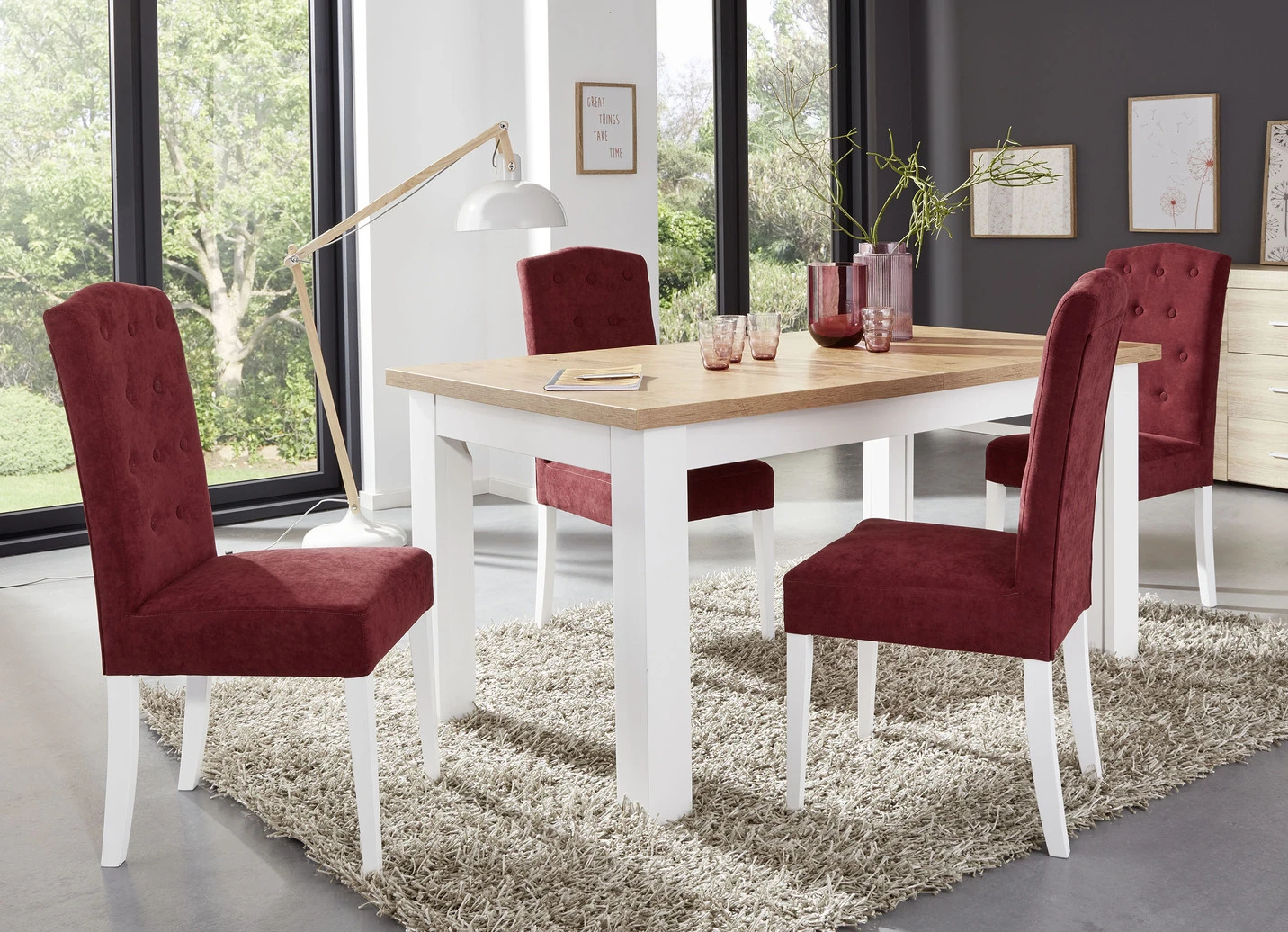 Diese modernen, stilvollen Esszimmermöbel werden die neuen Hingucker in Ihrem Essbereich werden! Tischbeine und Stühle sind aus massivem Buchenholz gefertigt, in Weiß. Durch den praktischen Auszug und die mitgelieferten Einlegeplatten (4x je 45 cm) ist der Tisch im Handumdrehen zu einer imposanten Tafel erweiterbar, an der auch größere Gesellschaften Platz finden. Die Rückenlehnen und die Sitzfläche der Stühle sind mit angenehmem Stoffbezug (100% Polyester) in 3 schönen Farben versehen. Mit Aufbau-Anleitung, die Stühle werden aufgebaut geliefert