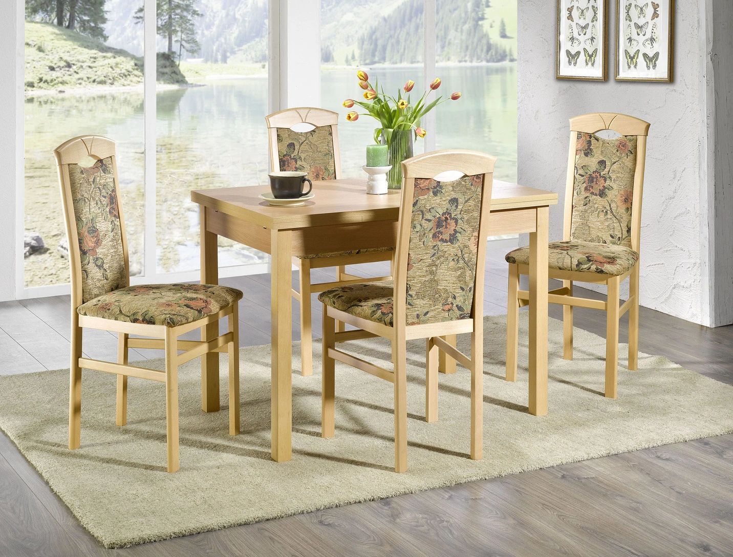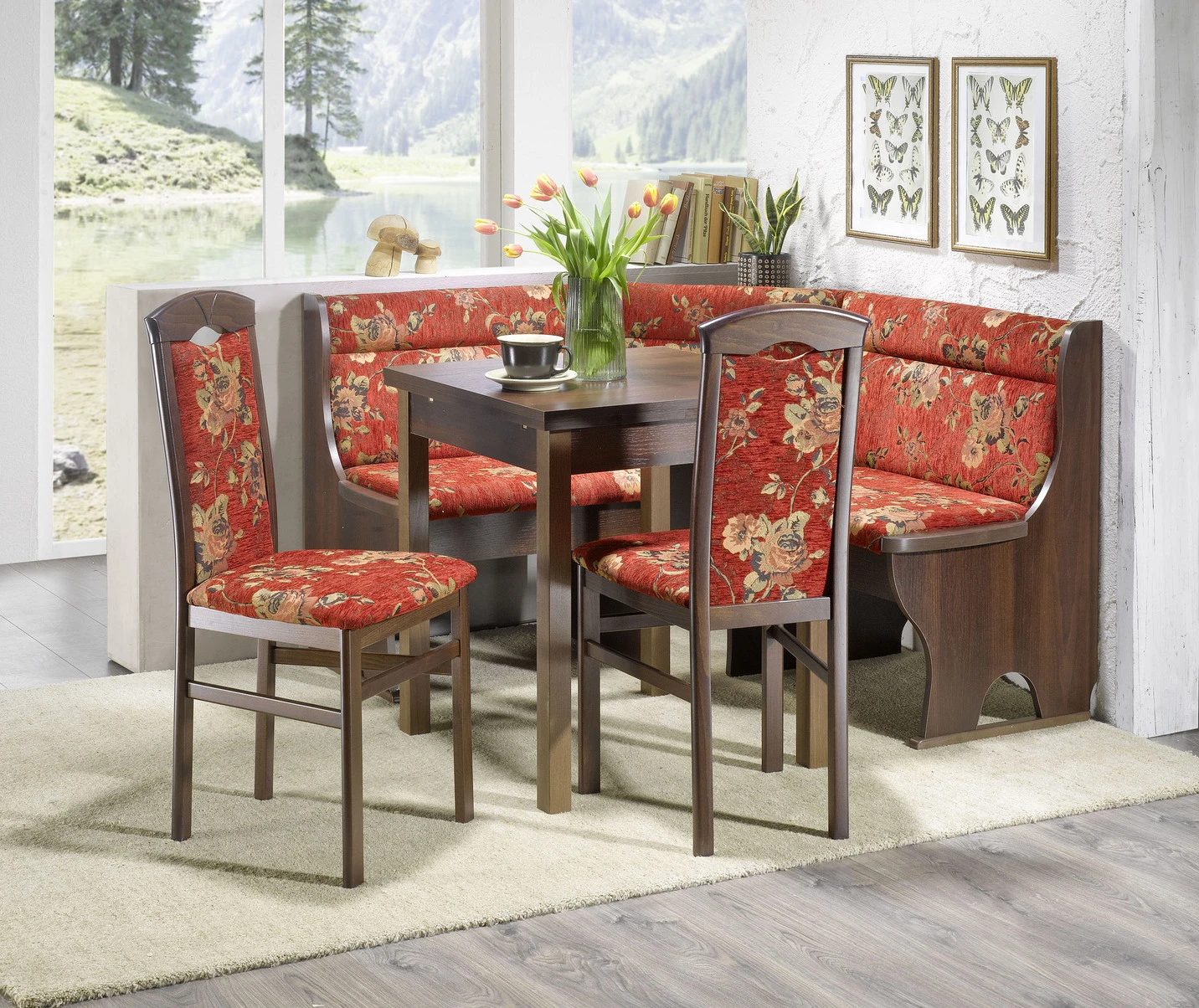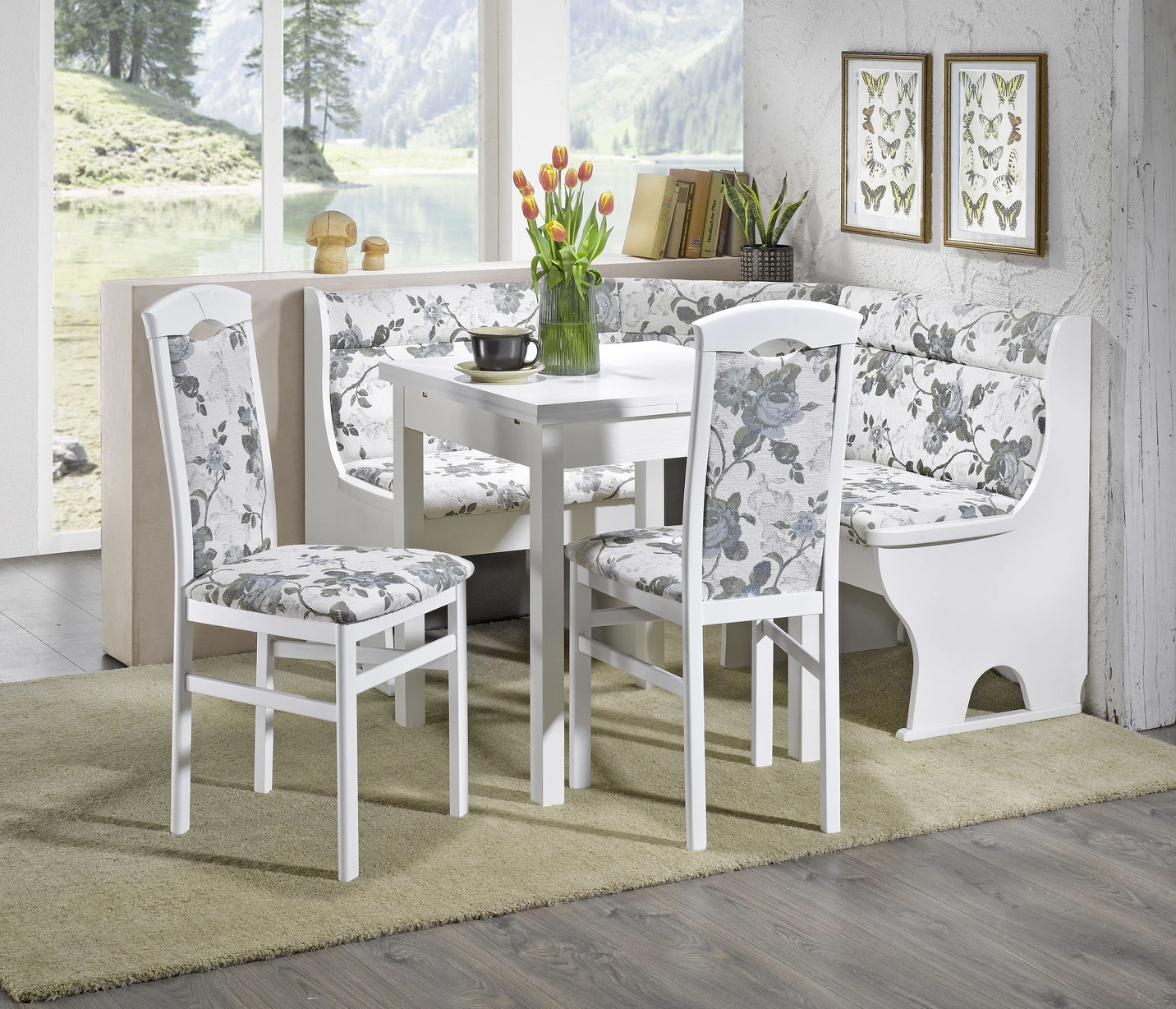 Diese einladenden Esszimmermöbel werden der neue Treffpunkt für alle Mahlzeiten in Ihrem Zuhause sein! Die Stühle und Beine der Tische sind aus massivem Buchenholz gefertigt. Sitzflächen und Rückenteile der Stühle und der Eckband sind komfortabel gepolstert und mit hübschem Stoffbezug versehen (100% Polyester). Die Tisch sind durch jeweils 1 Ansteckplatte links und rechts im Nu um stattliche 60 cm erweiterbar. Eckbank mit großem Stauraum unter den mit Gasdruckfedern gesichterten Polstern. Esstisch und Eckbank mit robuster, pflegeleichter Melamin-Oberfläche. Die Stühle werden aufgebaut geliefert, der Tisch und die Eckbank mit Aufbau-Anleitung