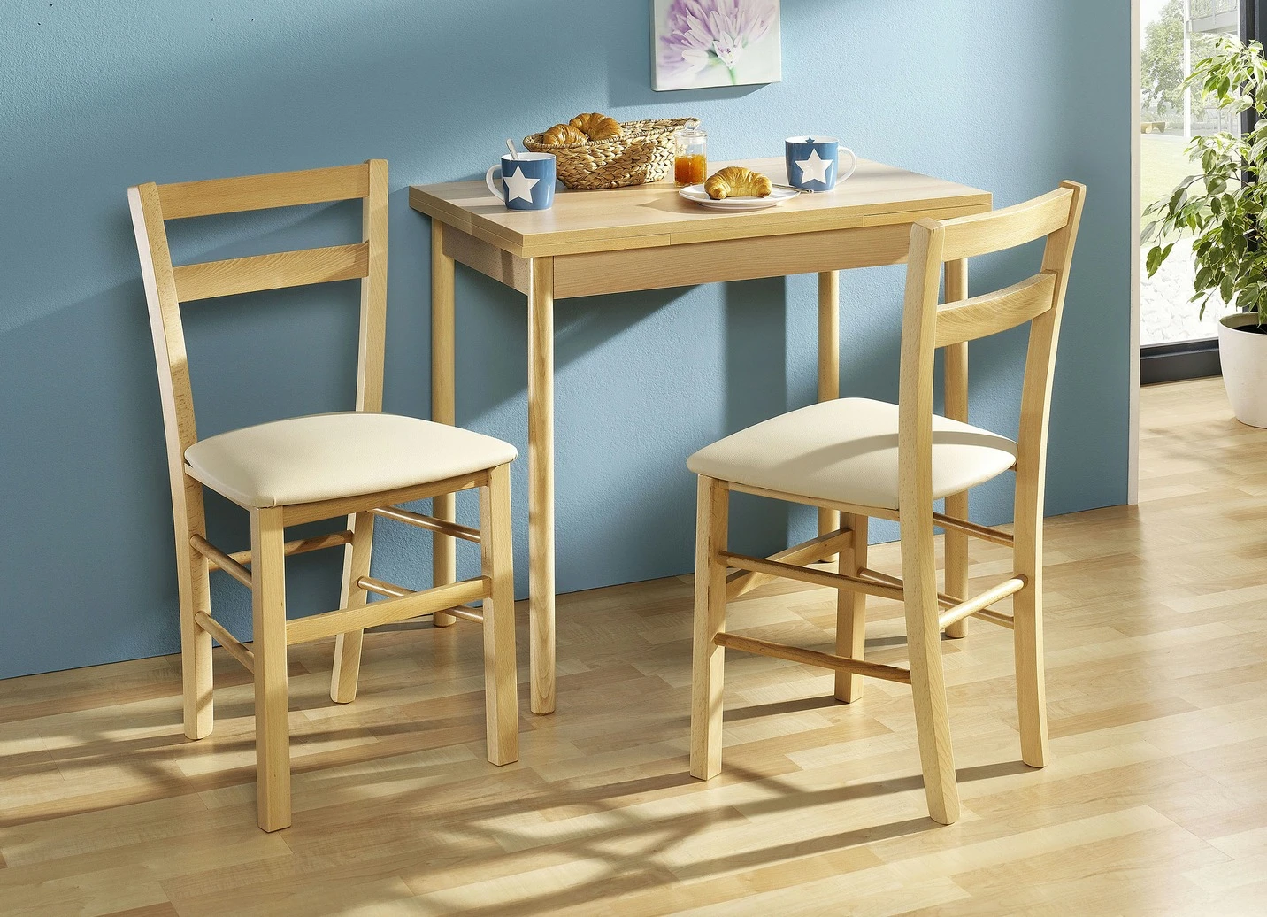 Diese schönen Esszimmermöbel werden Sie begeistern! Stühle und Tischbeine sind aus massiver Buche gefertigt. Tischplatte melaminbeschichtet und durch 2 seitliche Auszüge erweiterbar. Stühle mit schaumstoffgepolstertem Sitz in Kunstleder.
