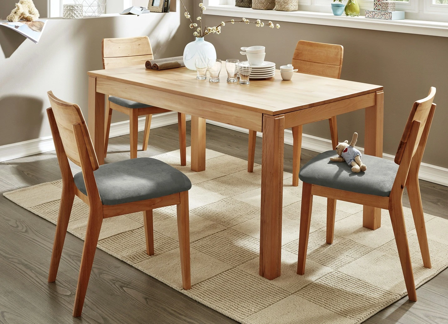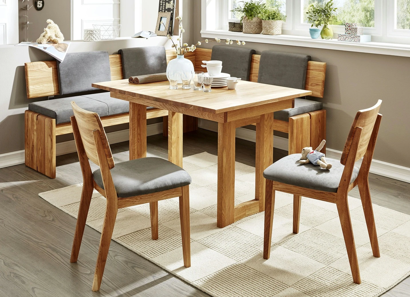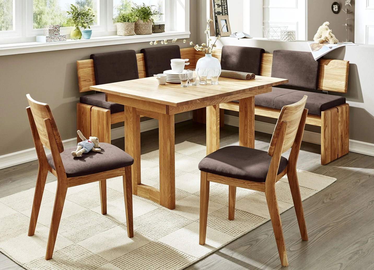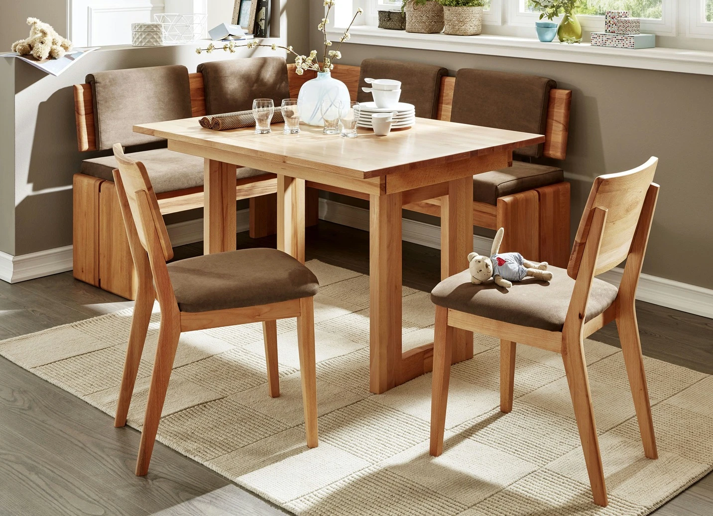 Esszimmermöbel in Kernbuche, geölt oder Eiche natur, geölt. Die Sitzflächen sind gepolstert, an den Rückenlehnen lassen sich die Rückenkissen (je B50,5xH34xT9 cm) nach links oder rechts verschieben. Bezugstoff in Nubuk-Optik (100% Polyester). Die Bänke bieten unter den Sitzflächen viel Stauraum. Mit Aufbau-Anleitung; Stühle werden aufgebaut geliefert.