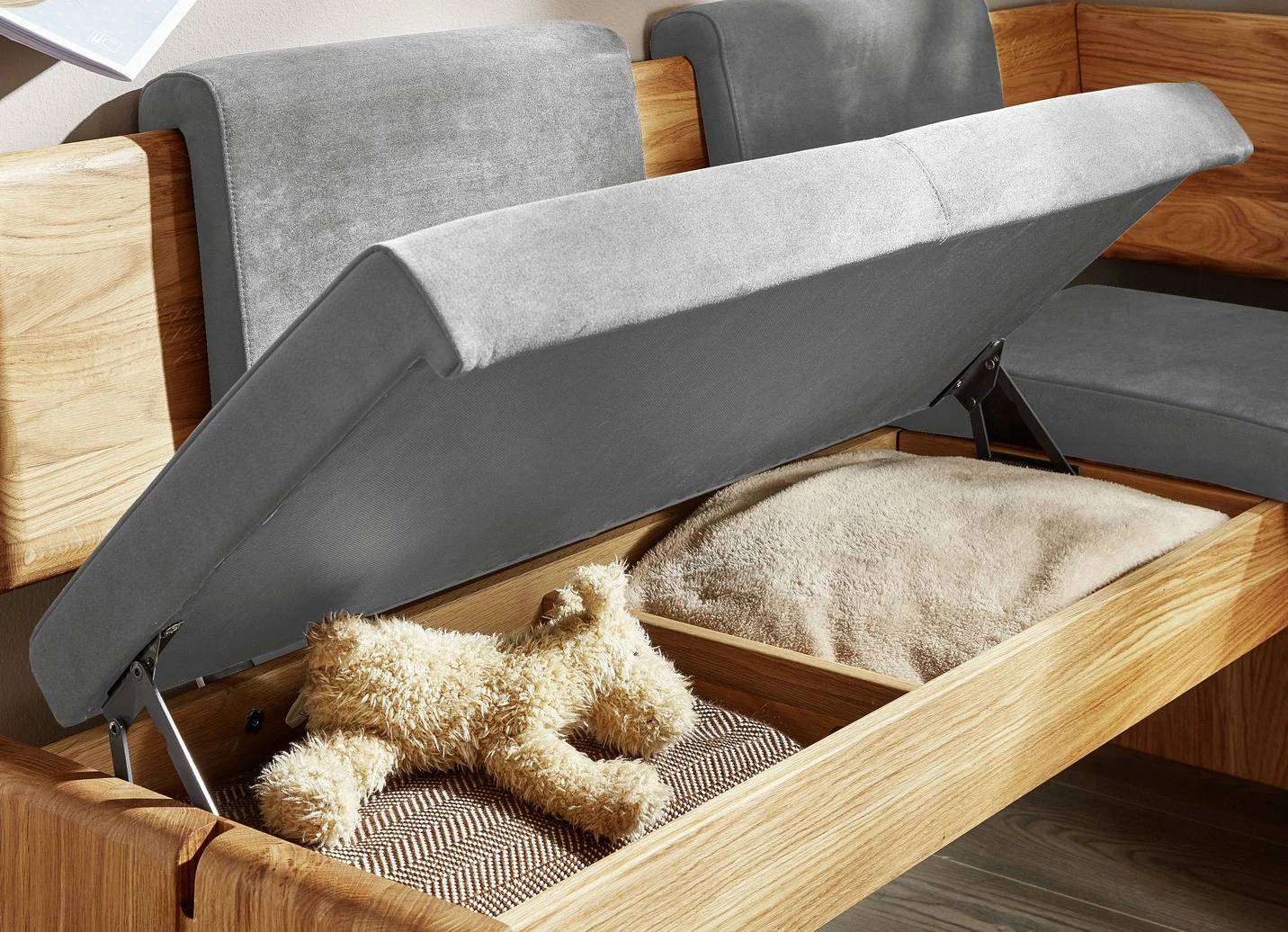 - Truhen-Eckbank wahlweise in 2 Stellvarianten (192×167 cm oder 167×192 cm), Höhe 91 cm mit Rückenkissen (4 Stück), Sitzhöhe 51 cm, Sitztiefe 43 cm