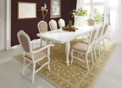 Elegante Esszimmermöbel mit hochglanzlackierter Oberfläche in Weiß. Die klassischen, weich gepolsterten Stühle aus massivem Buchenholz sind mit hochwertigem Schaumstoff, aufwendigen Schnitzereien am Holzgestell und schmuckhaftem Nagelzierband an der Rückenlehne gefertigt. Edel dessinierter Bezug