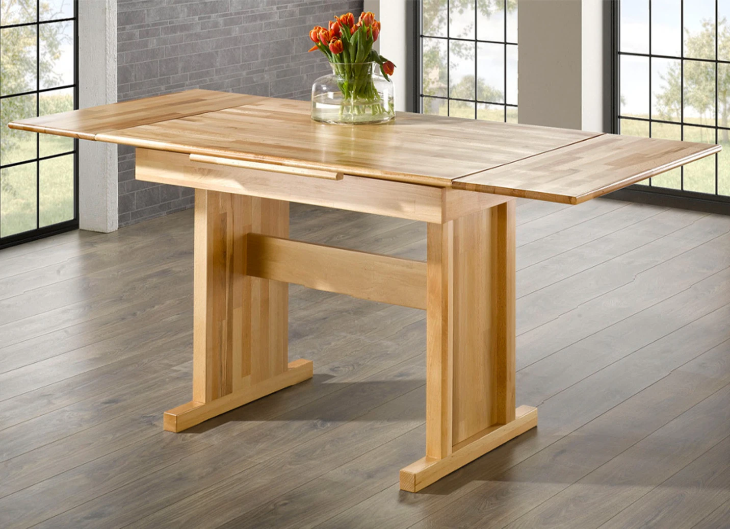 Stilvolle und rustikale Esszimmermöbel! Tisch und Stühle aus massivem Buchenholz und beidseitig montierbare, teilmassive Eckbank mit Stauraum unter der Sitzfläche. Tisch durch Auszugsmechanismus um 70 cm erweiterbar. Sitzfläche der Stühle sowie Sitzfläche und Rückenlehnen der Eckbank mit Schaumstoff gepolstert und mit angenehmem Microvelours-Bezug (100% Polyester) bezogen. Tisch (B120–190xH79xT80 cm) und Eckbank mit Aufbau- Anleitung, die Stühle werden aufgebaut geliefert