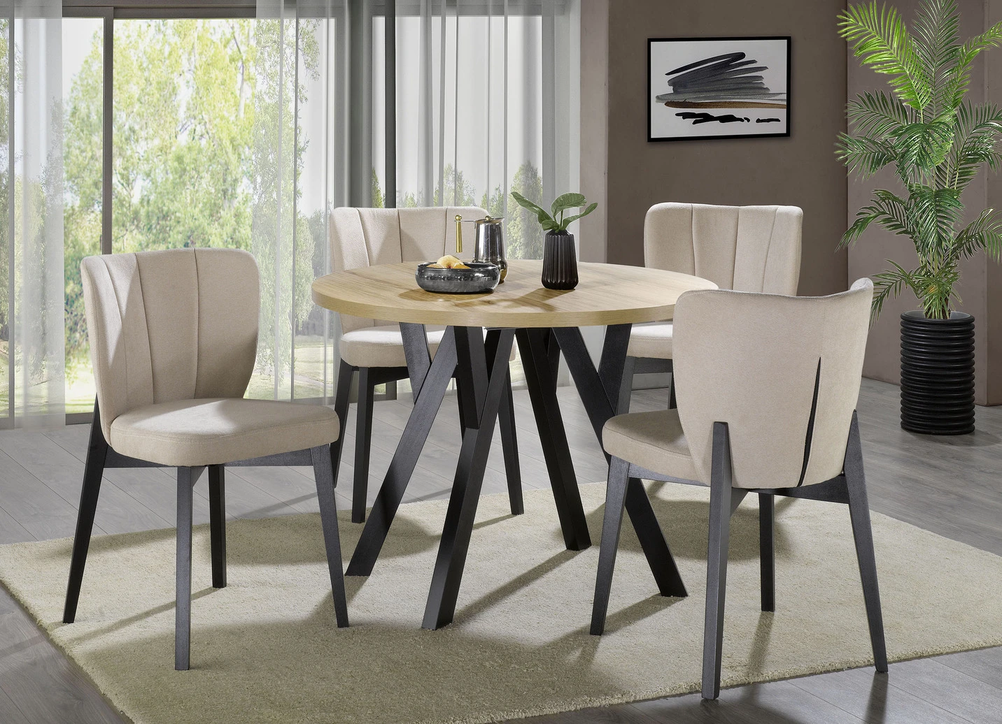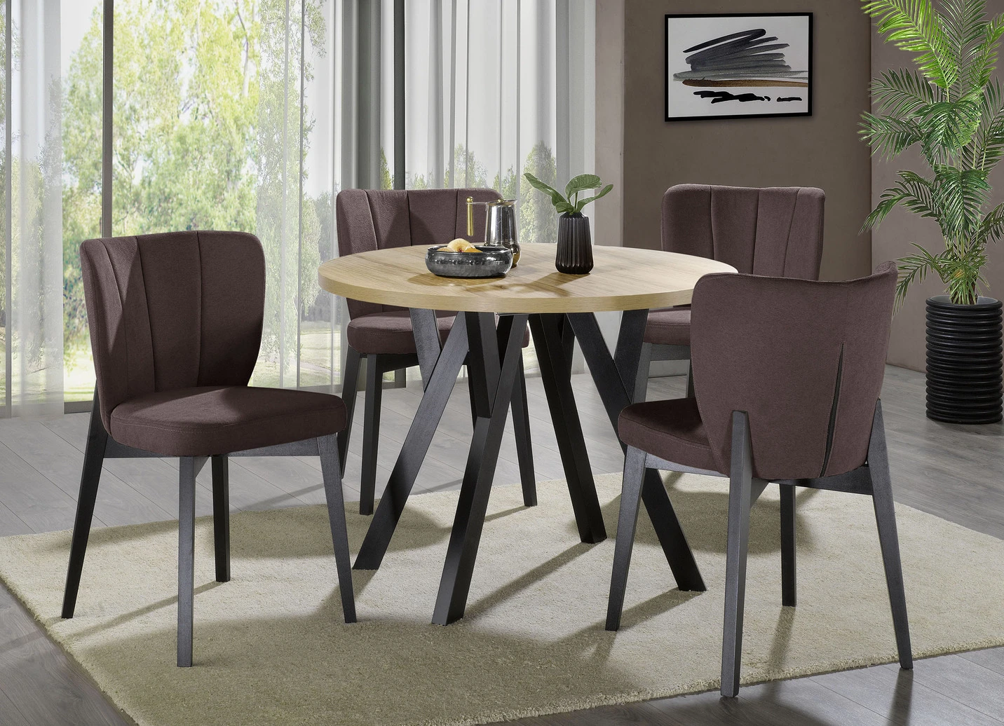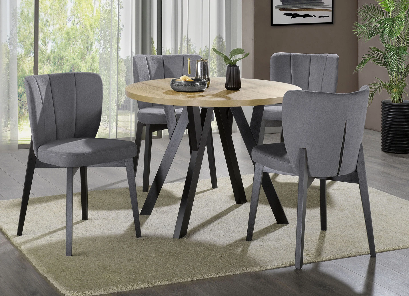 Freuen Sie sich auf neue teilmassive Esszimmermöbel im schicken Design! Gepolsterte Stühle mit Textilbezug aus Mikro-Velour (100% Polyester). Mit massiven schwarzen Buchenholzfüßen. Die Stühle werden aufgebaut geliefert