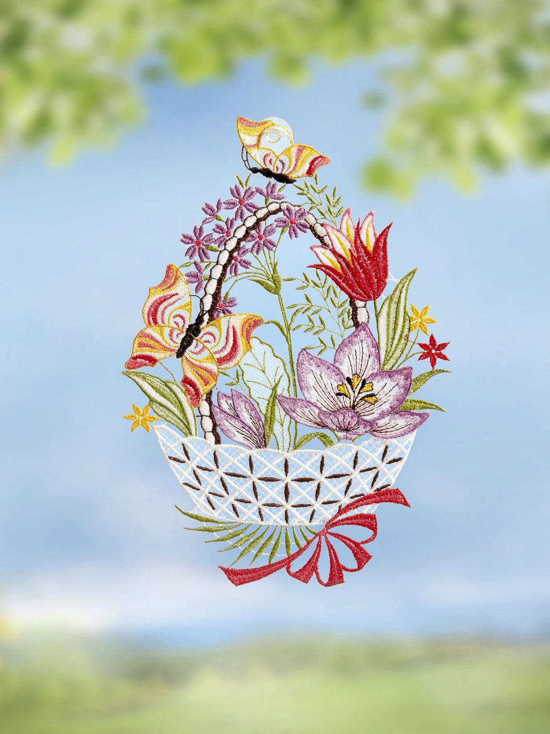 Voller farbenfroher Frühlingsblumen ist dieser feine Korb gefüllt, der verspielte Schmetterlinge anlockt. Hochwertiges Fensterbild aus Plauener Spitze. Aus 100% Polyester. Mit Saughaken zur einfachen Befestigung.