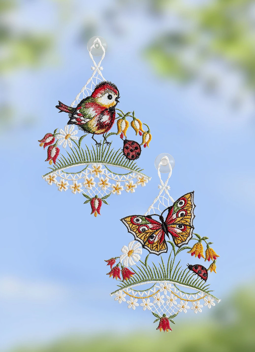 Das einfach niedliche Vöglein und der farbenfrohe Schmetterling sorgen auf diesem Fensterbild, 2er-Set aus echter Plauener Spitze für einen frühlingshaften Ausblick.