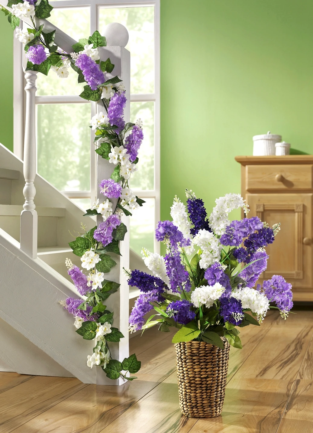 Lilafarbener Flieder wurde hier zusammen mit weißen Blüten und grünen Blättern zu einer langen Girlande aneinandergereiht. Aus hochwertigem Kunst- und Textilmaterial gefertigt