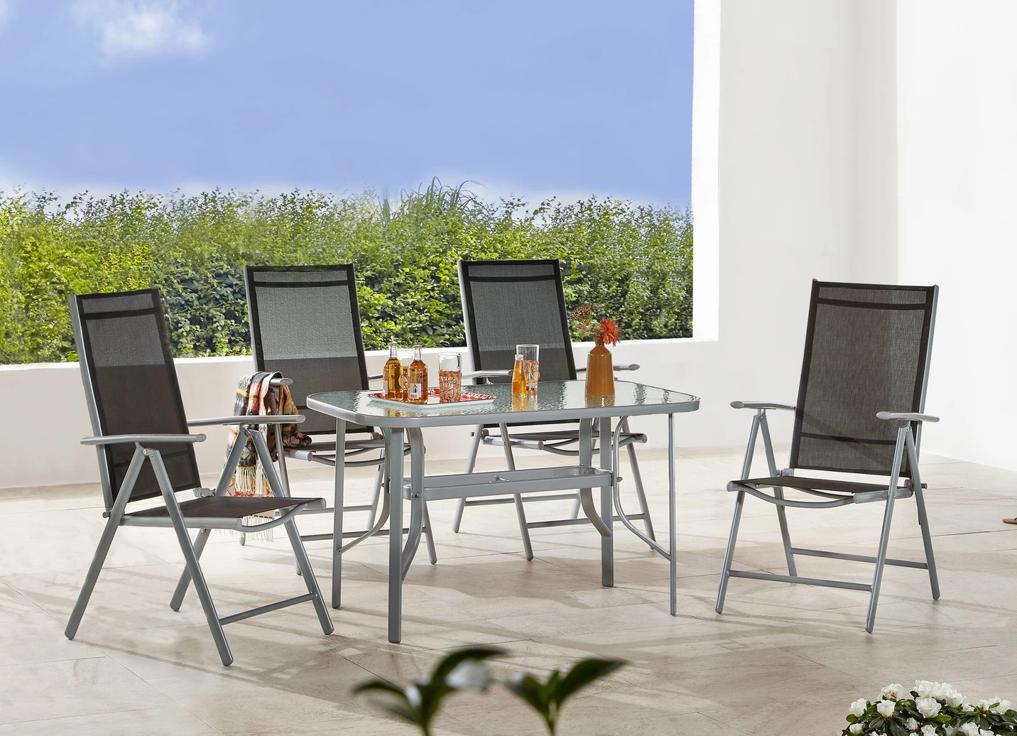 Mit diesem Gartenmöbel-Set werden Sie Ihre freie Zeit noch schöner und bequemer genießen können. Die hochwertigen, 7-fach verstellbaren Aluminium-Klappsessel mit schwarzem Textilen-Gewebe (Polyester