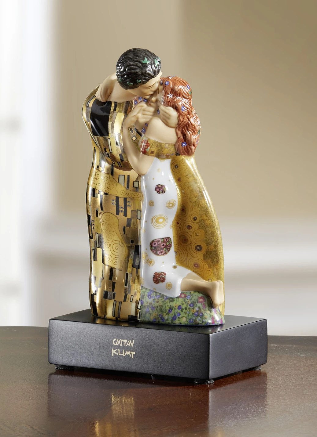 Diese wundervolle Figur zeigt Der Kuss. Es gilt als das bedeutendste Werk von Gustav Klimt – eine weltberühmte Ikone der Liebe. Es entstand in den Jahren 1907–1908, einer Zeit, die als Klimts goldene Phase bezeichnet wird. Im traditionsreichen Haus Goebel aus hochwertigem Porzellan mit Echtgold-Auflage gefertigt und auf einen Holzsockel drapiert. Maße: B10xH17,5xT6,5 cm