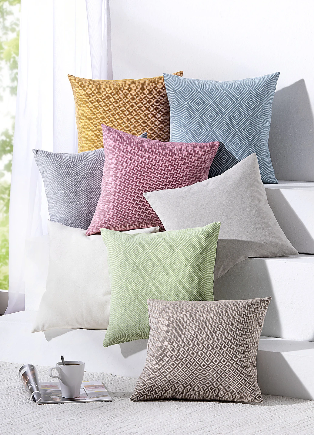 Die hochwertigen, jacquard-gewebten Kissenbezüge sind farblich perfekt aufeinander abgestimmt. Ob Uni, kleine Raute oder große Raute – alles passt prima zusammen. Mit Reißverschluss.