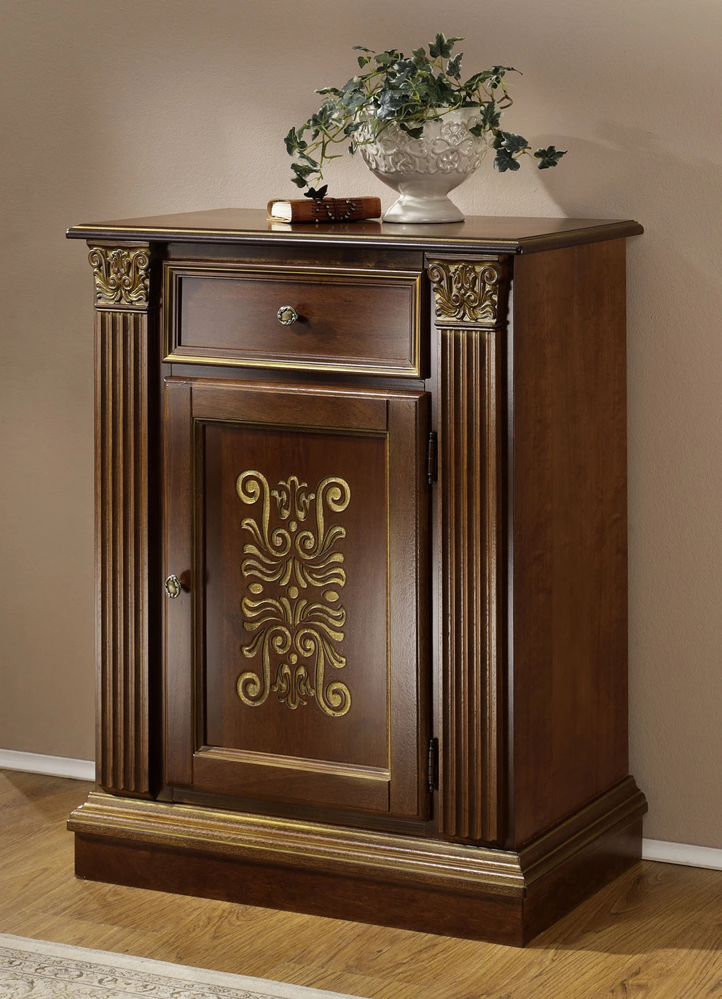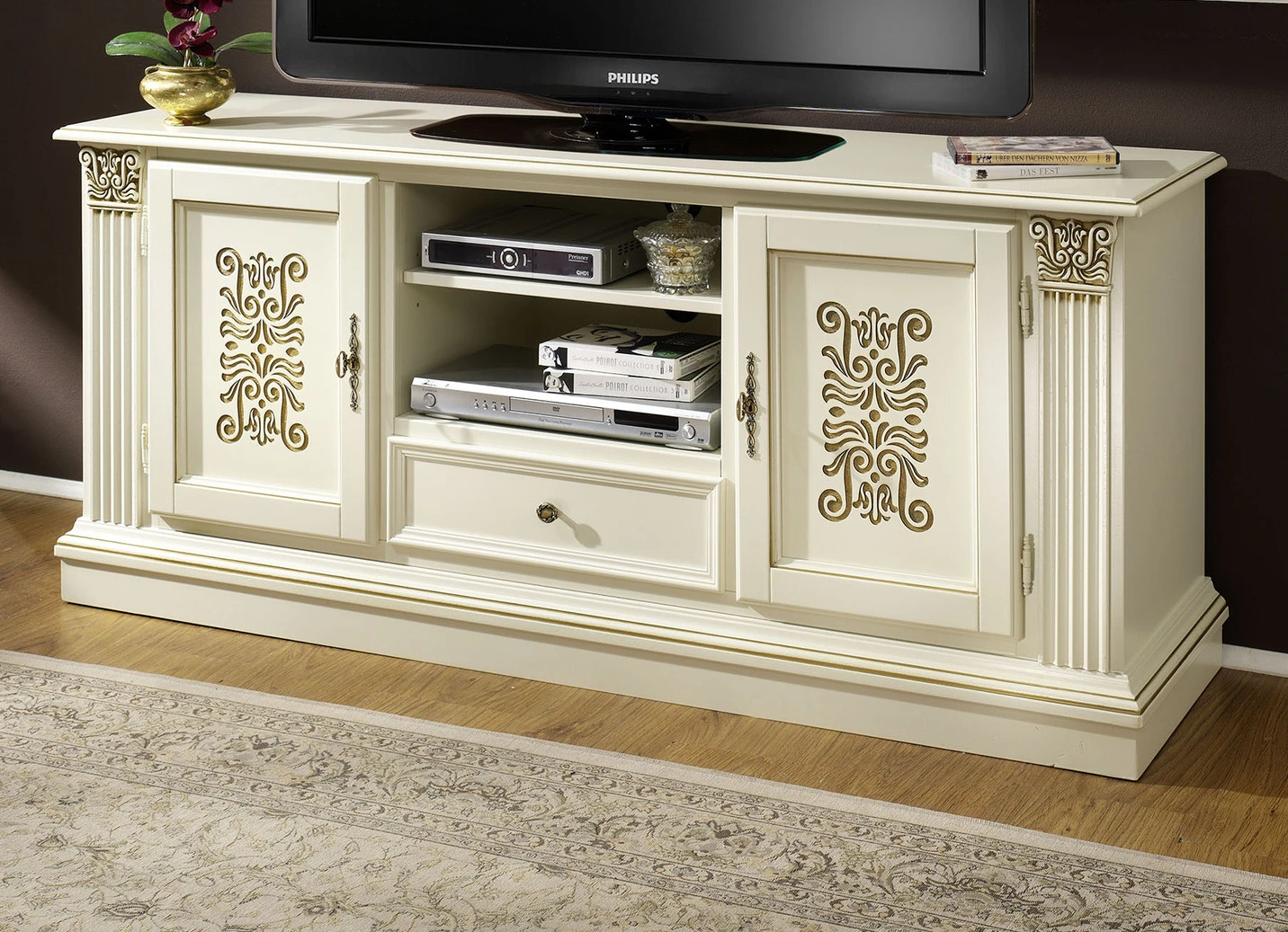 Mit ihrem umwerfenden italienischen Charme möchte diese hochwertige Möbelserie in Ihrem Wohnzimmer Einzug halten. Teilmassiv gefertigt begeistert sie vor allem durch die aufwendigen Verzierungen an den Türen und der Gestaltung der Seitenteile in Säulen-Optik. Knopf-Griffe aus Metall, Verzierungen in Goldfarben. Die Lieferung erfolgt aufgebaut