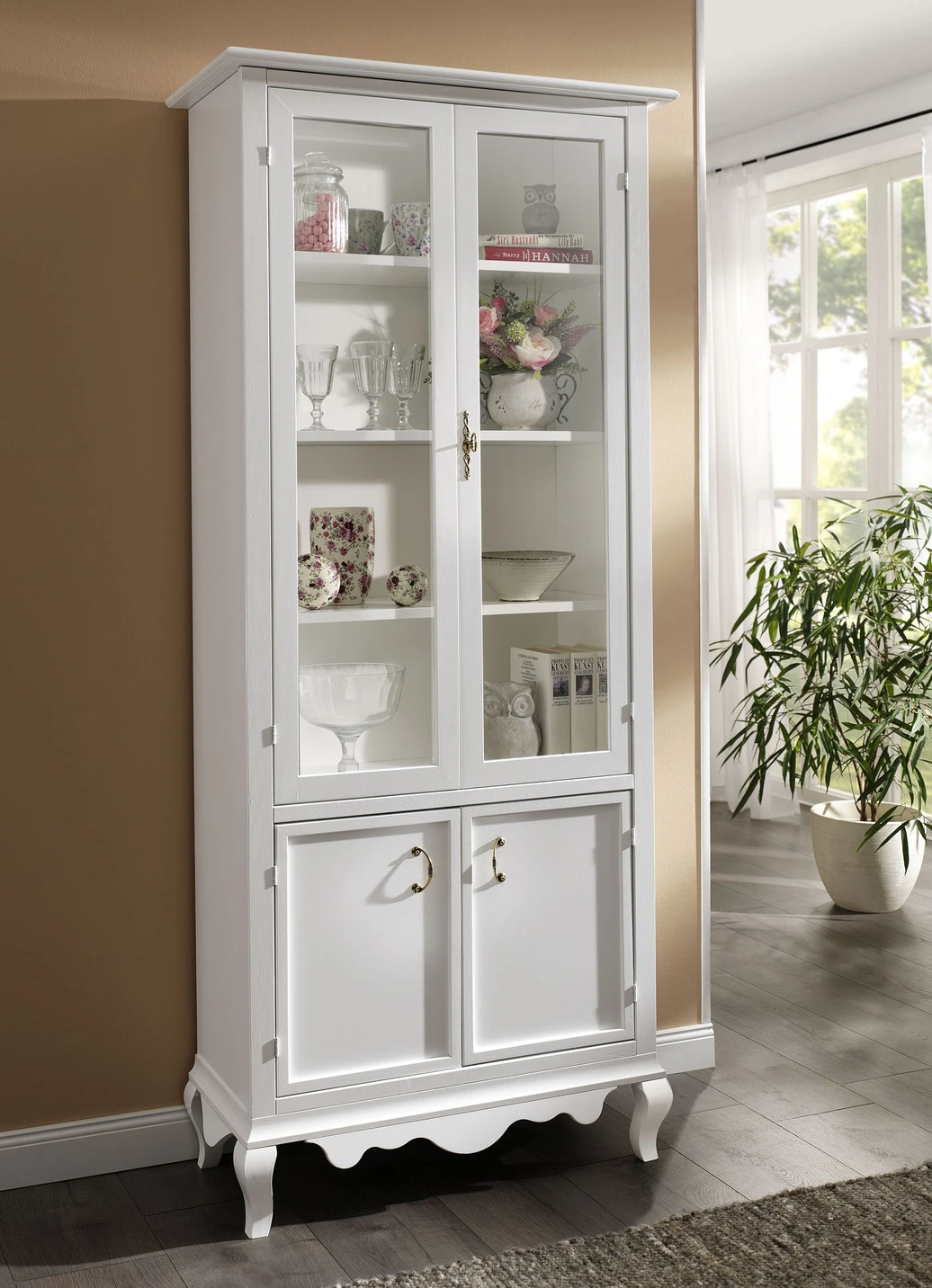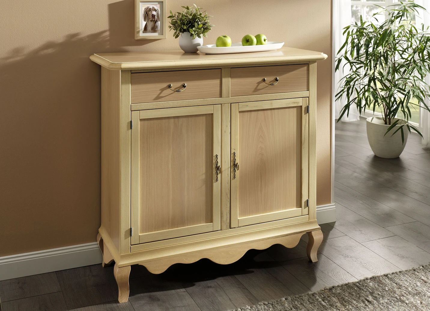 Zeitlos schöne, hochwertig verarbeitete, teilmassive Möbelserie mit schönen Metallgriffen an den Türen und Schubladen. Mit geschwungenen Sockeln und Beinen. Die Lieferung erfolgt aufgebaut