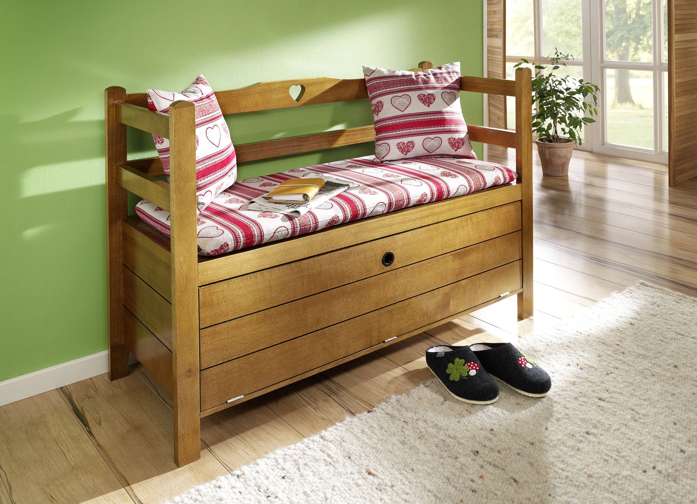 Diese hochwertige Sitzbank begeistert mit ganz besonderem Charme! Aus teilmassivem Holz gefertigt, mit Herz in der aufwendig geschwungenen Rückenlehne. Das aufklappbare Fach mit Magnetverschluss bietet Ihnen nützlichen Stauraum.