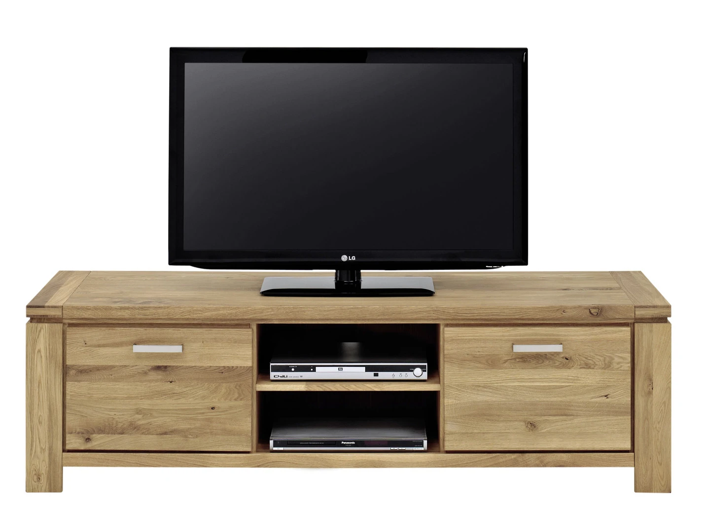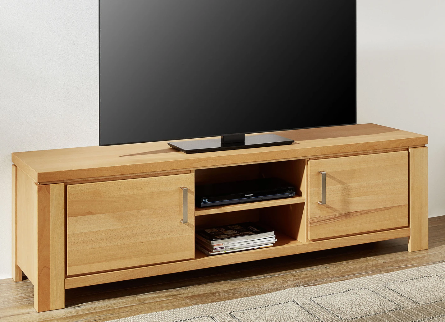 TV-Longboard: Mit 2 Türen, dahinter je 1 Einlegeboden, 2 offenen Fächern mit 1 Einlegeboden (lichte Maße je: B50xH16xT42 cm). Maße: B175xH51xT45 cm