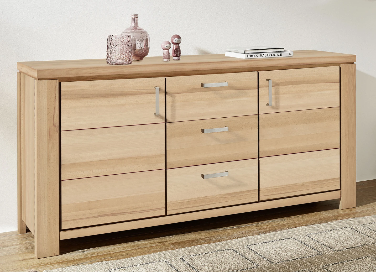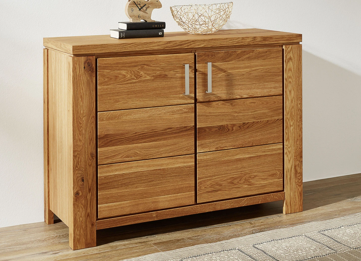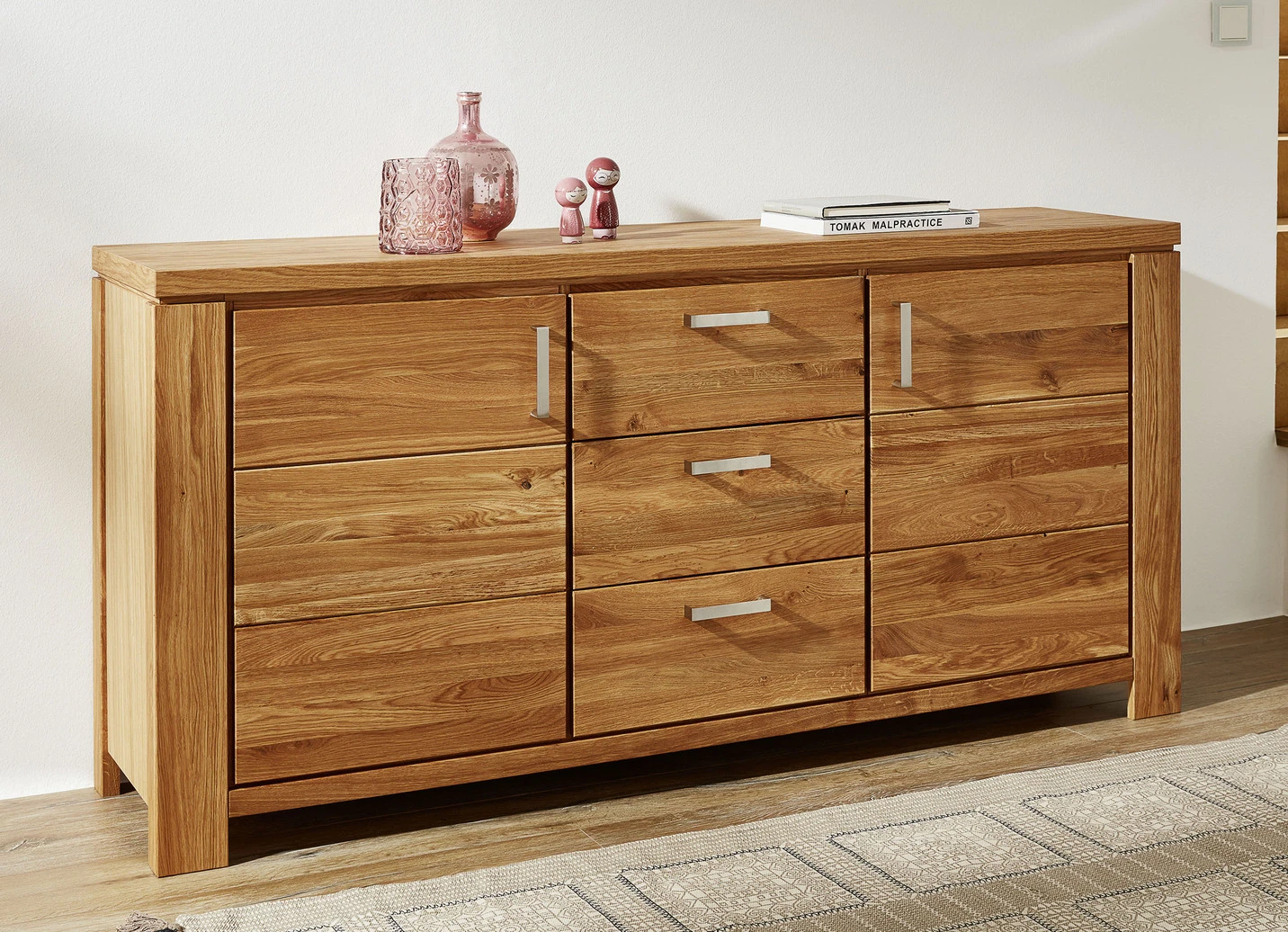 Hochwertiges Möbelprogramm mit Massivholzfronten und durchgehender Lamelle. Korpus aus Echtholz-Furnier, in Kernbuche oder Wildeiche geölt. Schubladen auf Metallführungsschienen mit Softclose. Stahlfarbene Aluminiumgriffe. Die Lieferung erfolgt aufgebaut