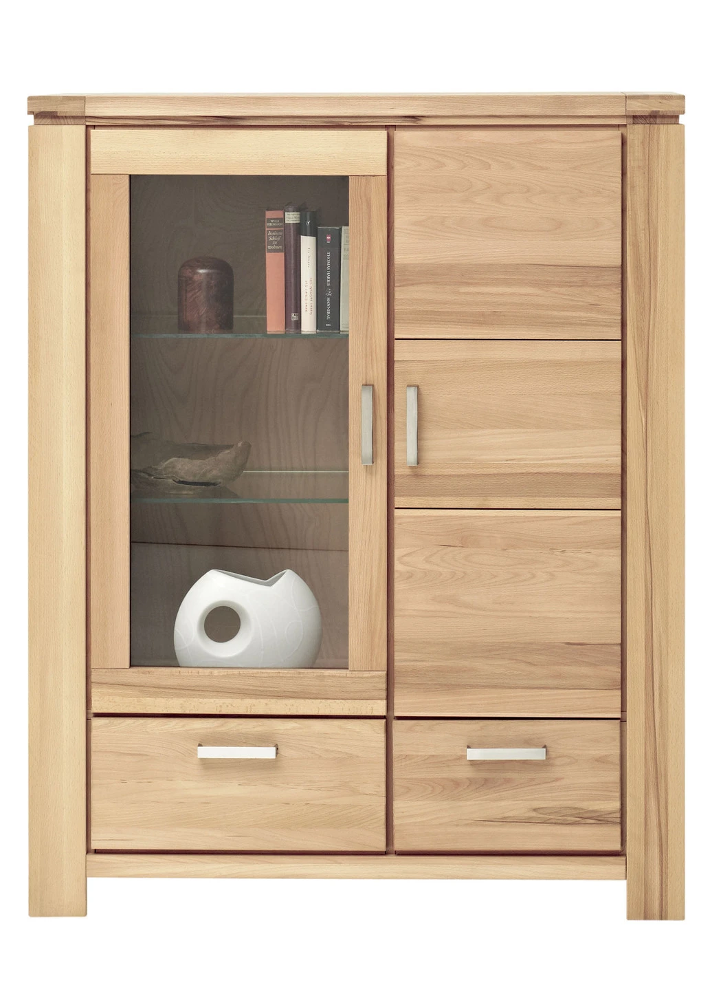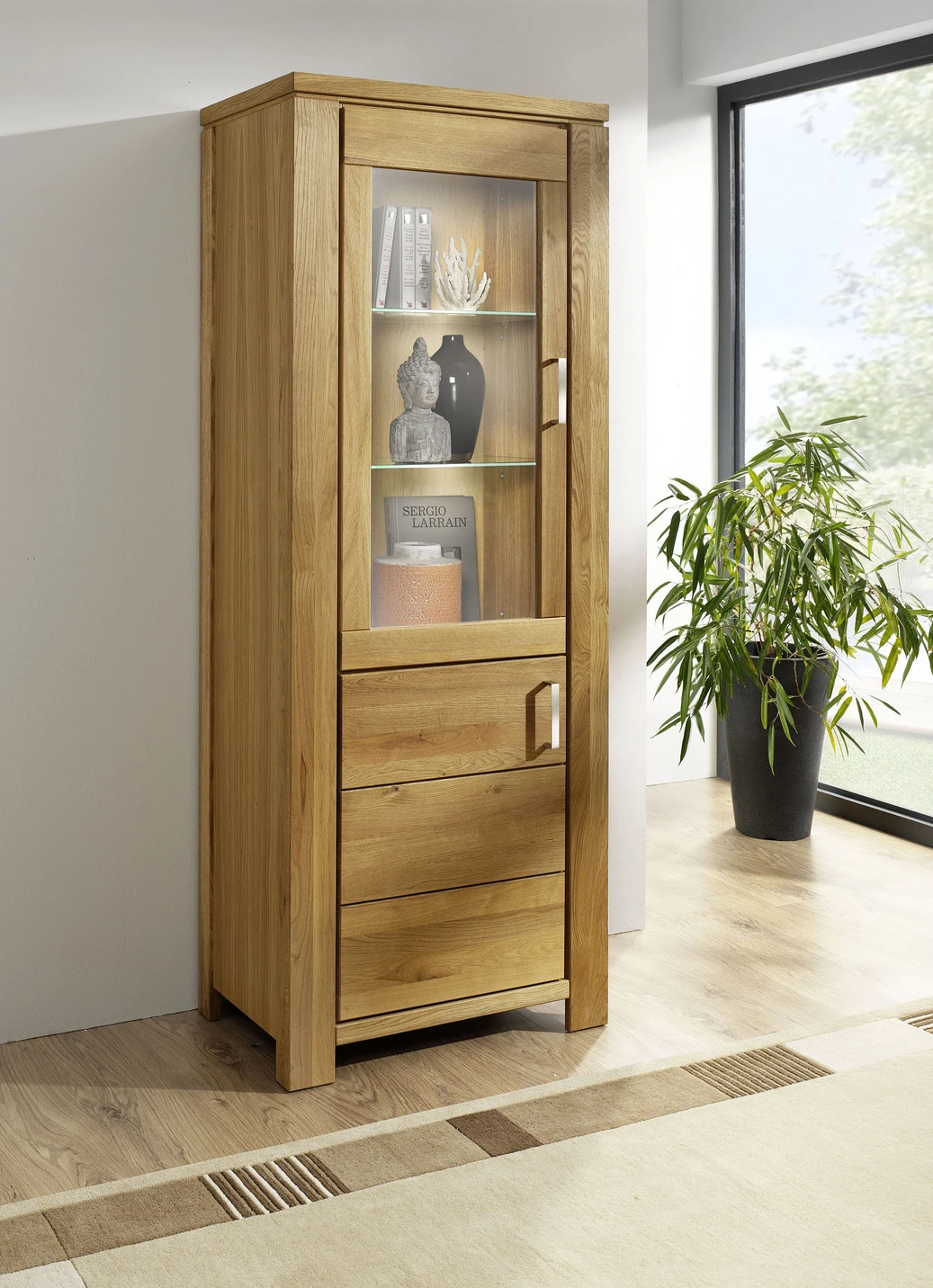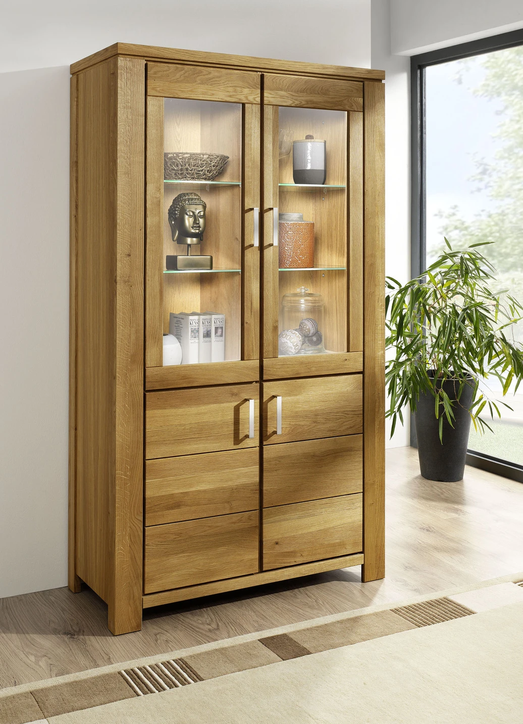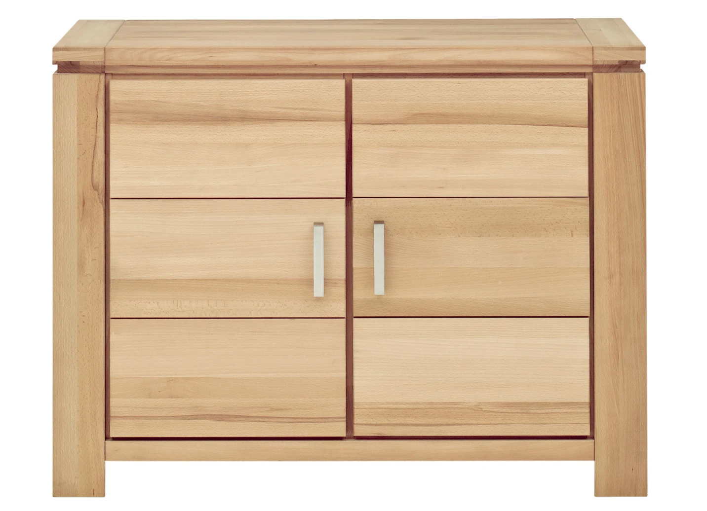 Hochwertiges Möbelprogramm mit Massivholzfronten und durchgehender Lamelle. Korpus aus Echtholz-Furnier, in Kernbuche oder Wildeiche geölt. Schubladen auf Metallführungsschienen mit Softclose. Stahlfarbene Aluminiumgriffe. Die Lieferung erfolgt aufgebaut