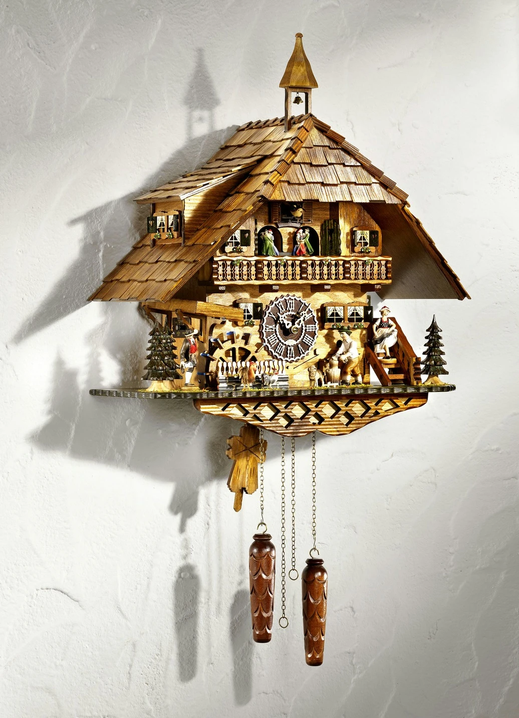 Traditionell im Schwarzwald in Handarbeit gefertigte Kuckucksuhr aus Holz. Das Häuschen ist mit liebevollen Details geschmückt, wie einem beweglichen Mühlrad und Holzhacker.