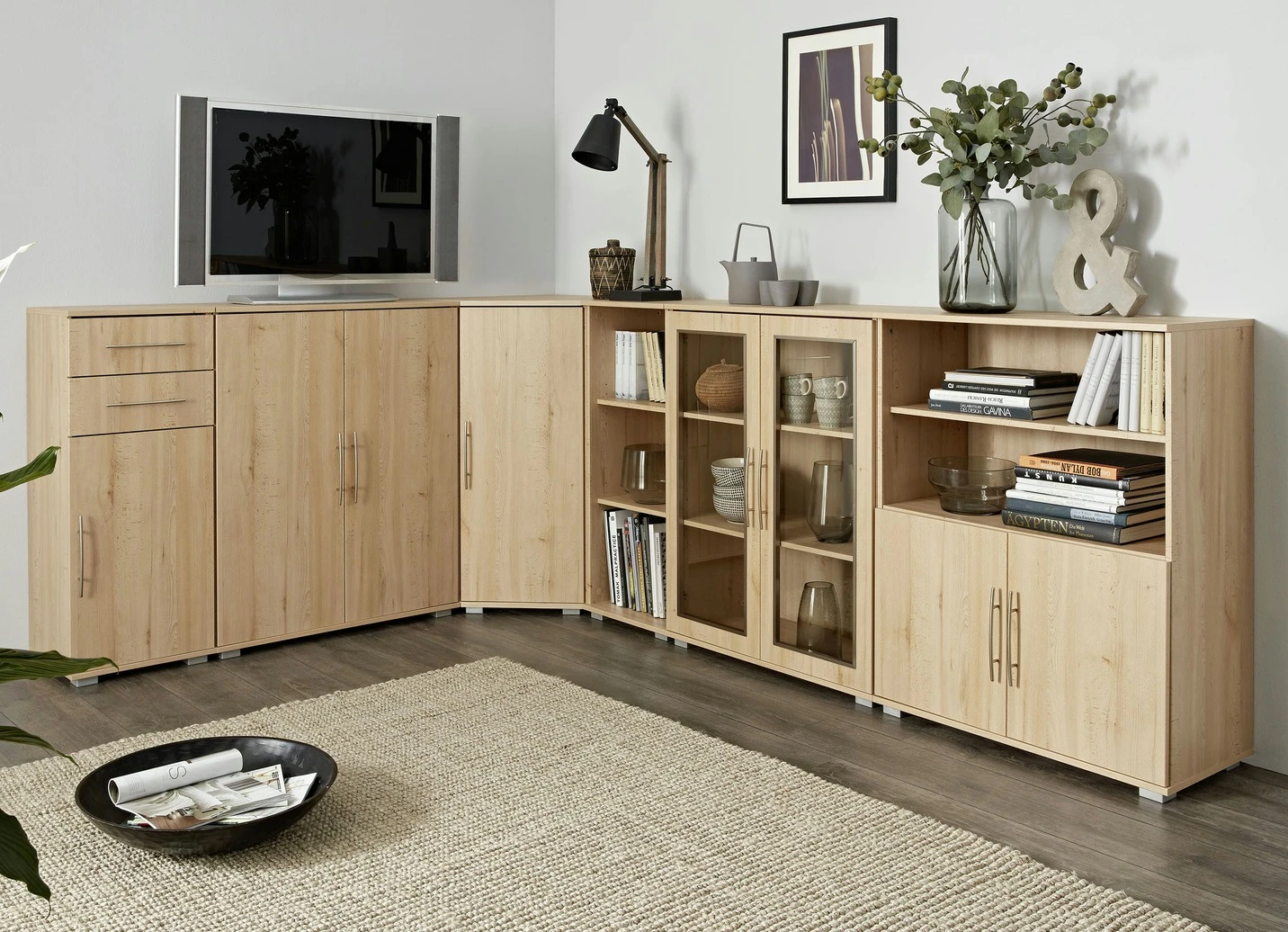 Dieses Möbelprogramm ist ideal zum individuellen Kombinieren, in 3 tollen Dekorvarianten. Silbermattfarbene Füße sowie edelstahlfarbene Metallgriffe. Schubladen auf Metallführungsschienen. Maße: Höhe je 103 cm, Tiefe je 38 cm. Mit Aufbau-Anleitung