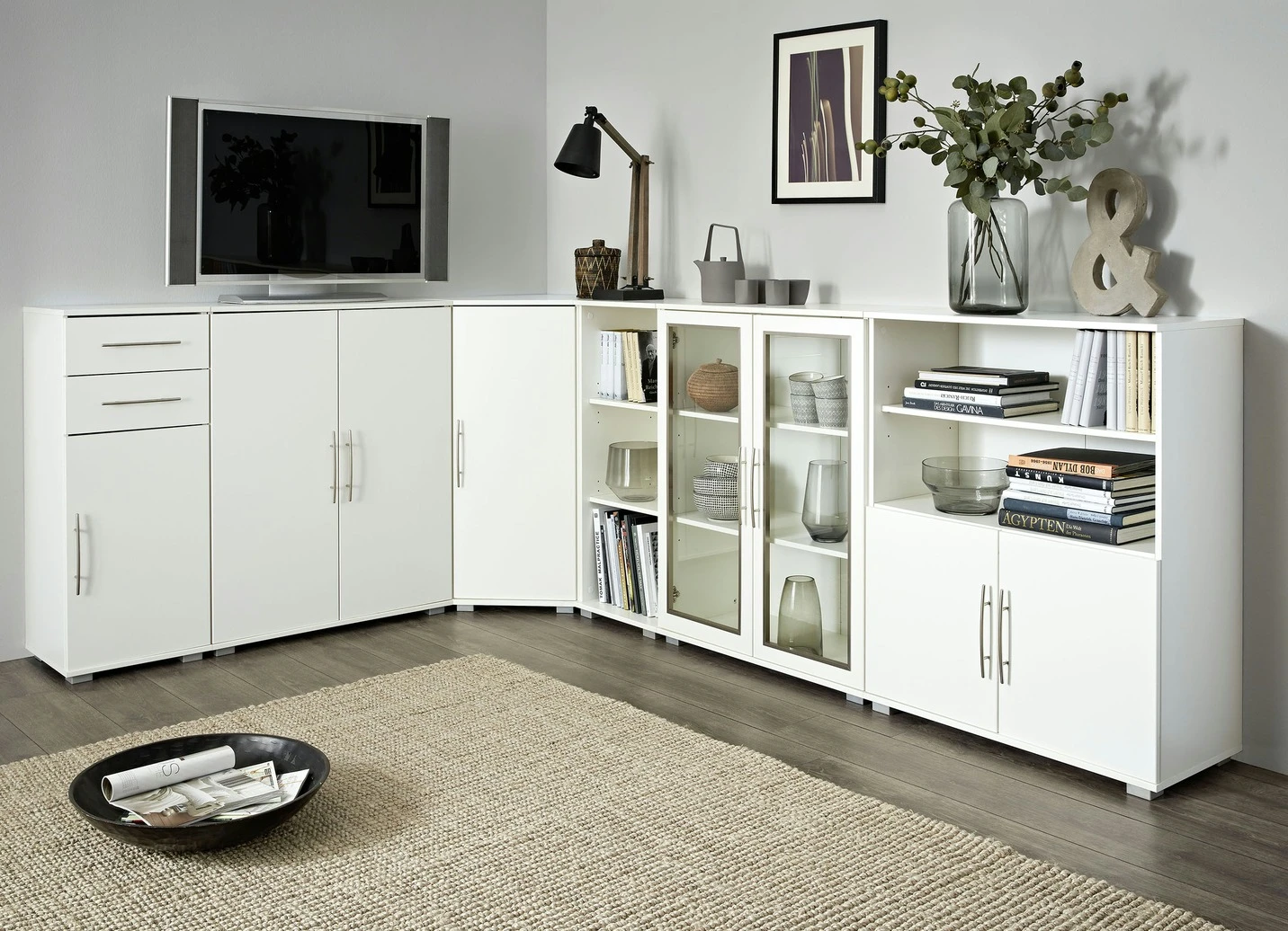 Individuell stellbares Möbelprogramm in verschiedenen Ausführungen in der Ausführung Regal und in Weiss.