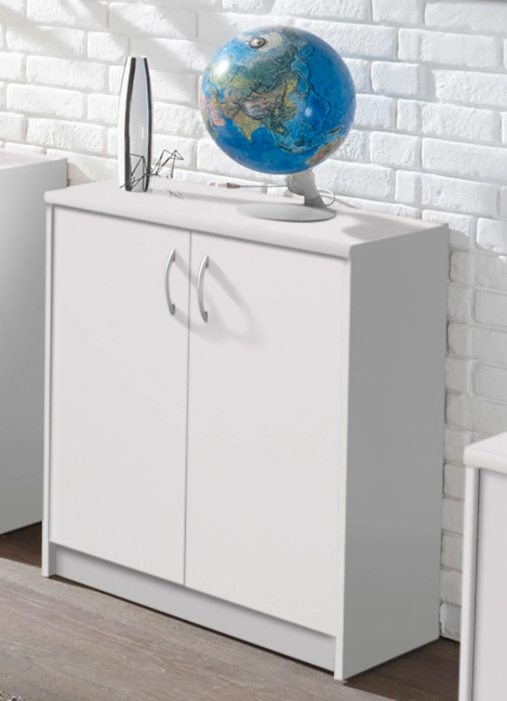 Kombifreundliche Kommode mit silberfarbenen Griffen in der Ausführung 2-türig, schmal und in Weiss.