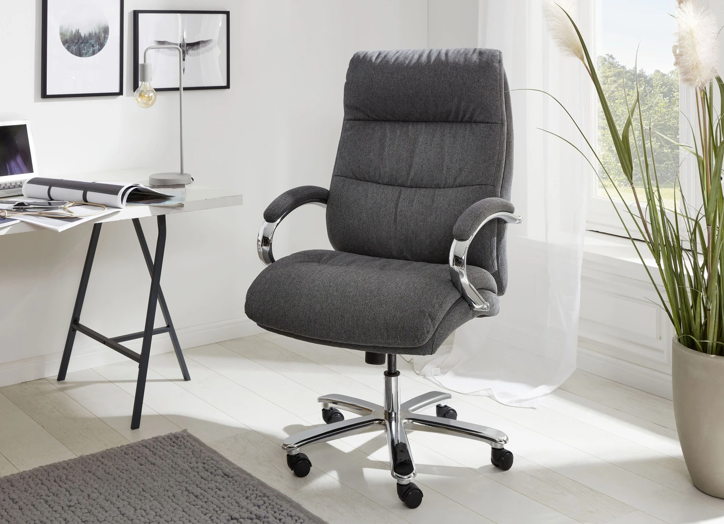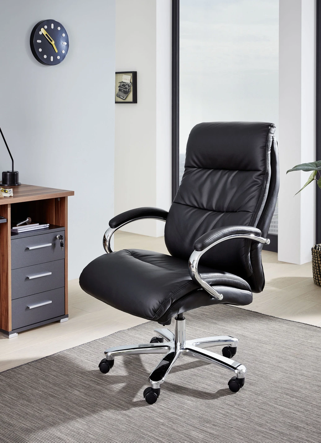 Komfortabler Chefsessel wahlweise mit hochwertigem Kunstlederbezug (100% Polyester) in Schwarz oder einem Webstoff in Grau (100% Polyester), gebremsten Sicherheits-Doppelrollen (nutzbar für feste Bodenbeläge), stufenloser Sitzhöhenverstellung durch Sicherheitsgasdruckfeder (LGA Bauart geprüft), Wippmechanik mit Härtegradeinstellung. Moderne, verchromte Armlehnen mit Polsterung. Fußkreuz aus besonders stabilem Metall. Belastbar bis zu 180 kg.
