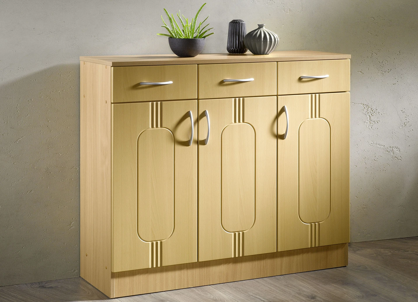 mit 3 Türen, dahinter 2 große und 2 kleine Fächer, darüber 3 Schubladen. Maße: B105xH89xT36,5 cm.
