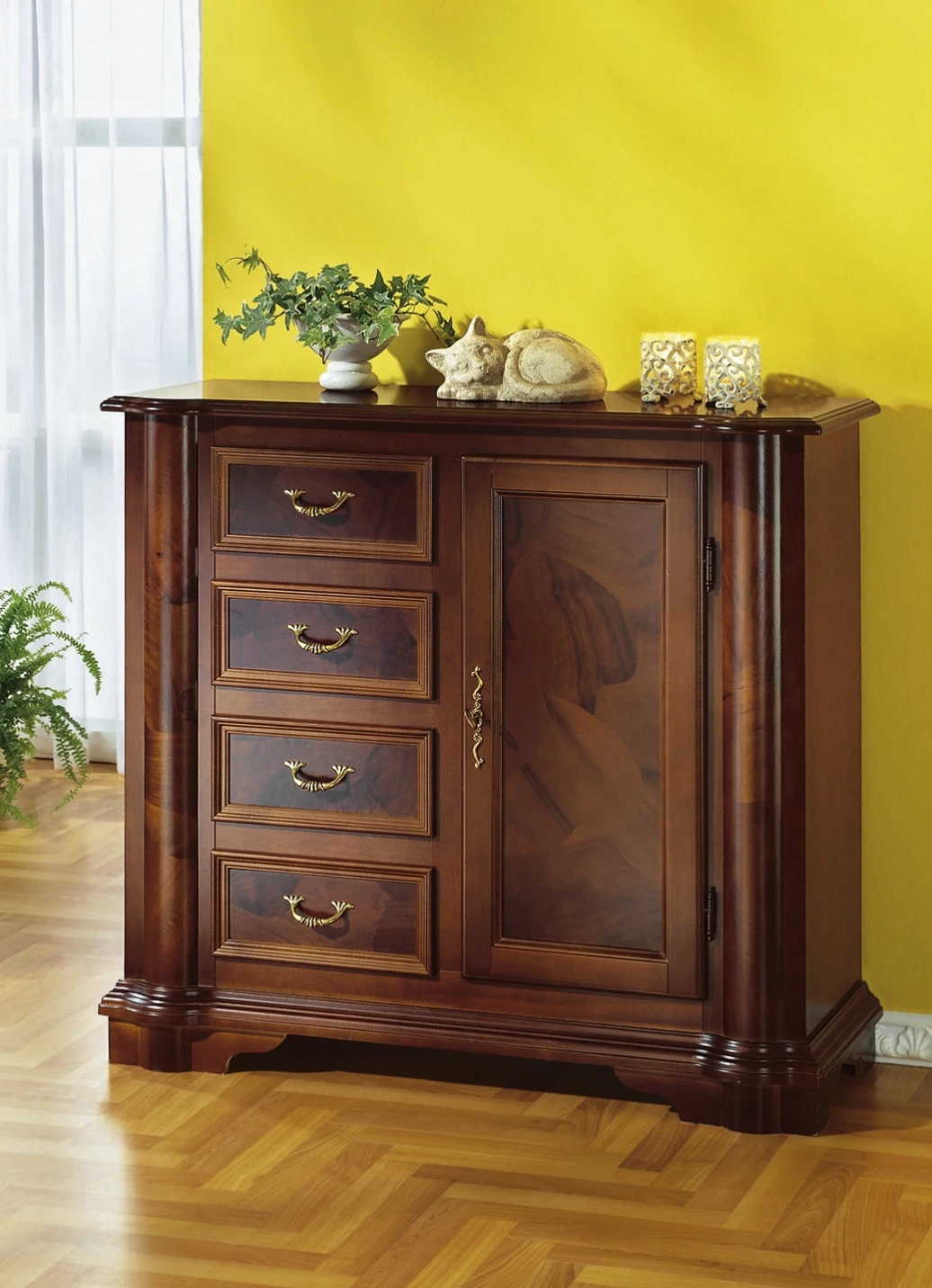 Prächtige, teilmassive Kommodenserie mit echtem Wurzelholzfurnier an den eleganten, gerundeten Säulen sowie den Türfronten. Die Lieferung erfolgt aufgebaut