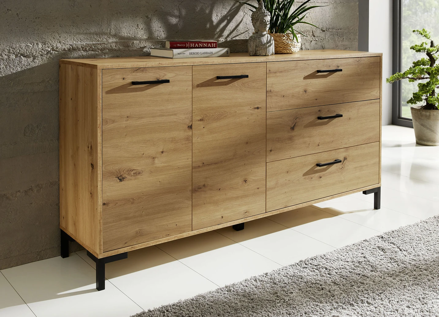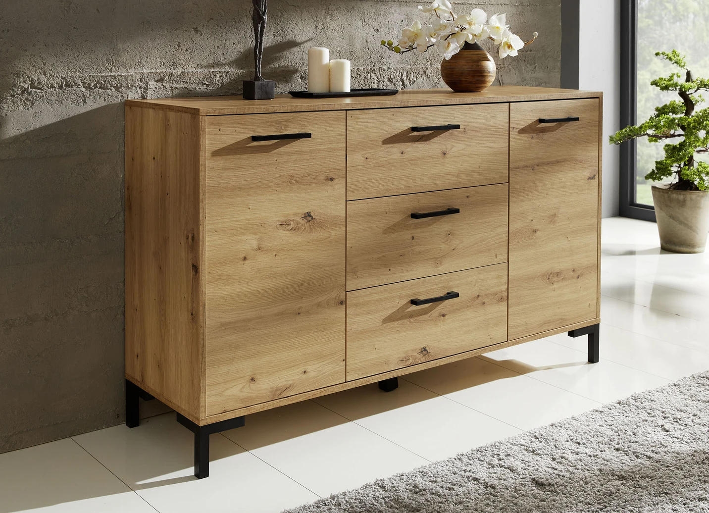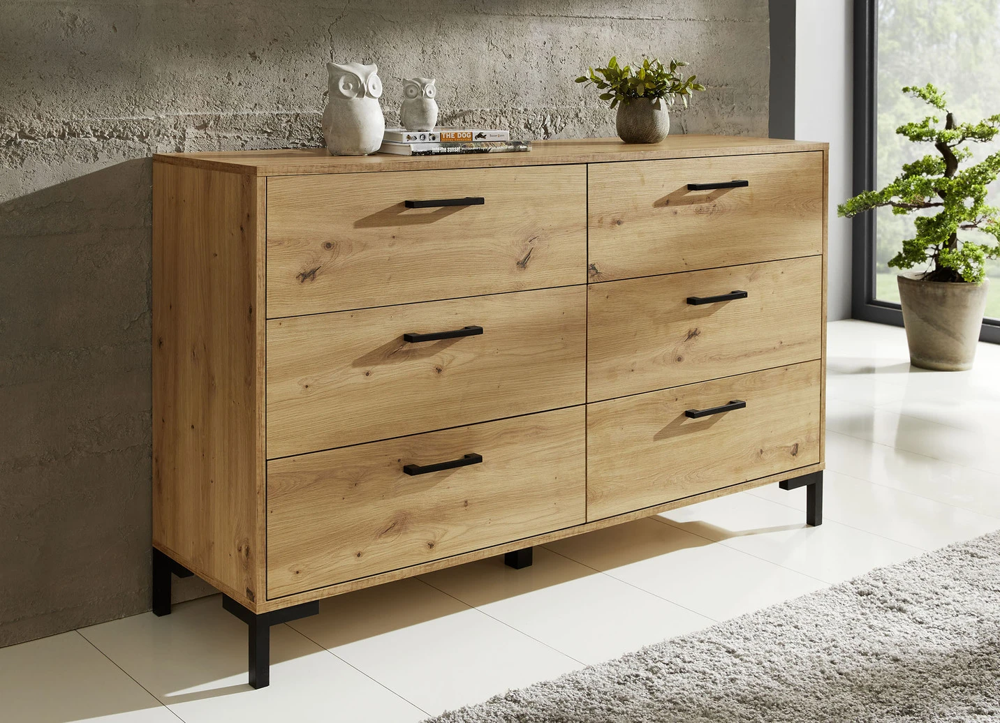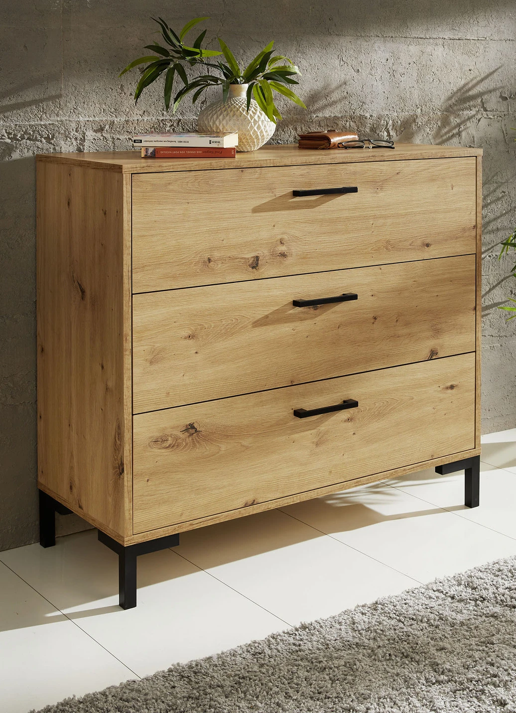 Elegante, moderne Kommodenserie in Artisan-Eiche. Die schwarzen Griffe und Füße aus strapazierfähigem Kunststoff verleihen den Modellen Stil und Charme. Mit kratzfester, laminierter Oberfläche, die einfach zu pflegen ist. Schubladen auf Kugellager-Führung. Mit Aufbau-Anleitung zur einfachen Endmontage