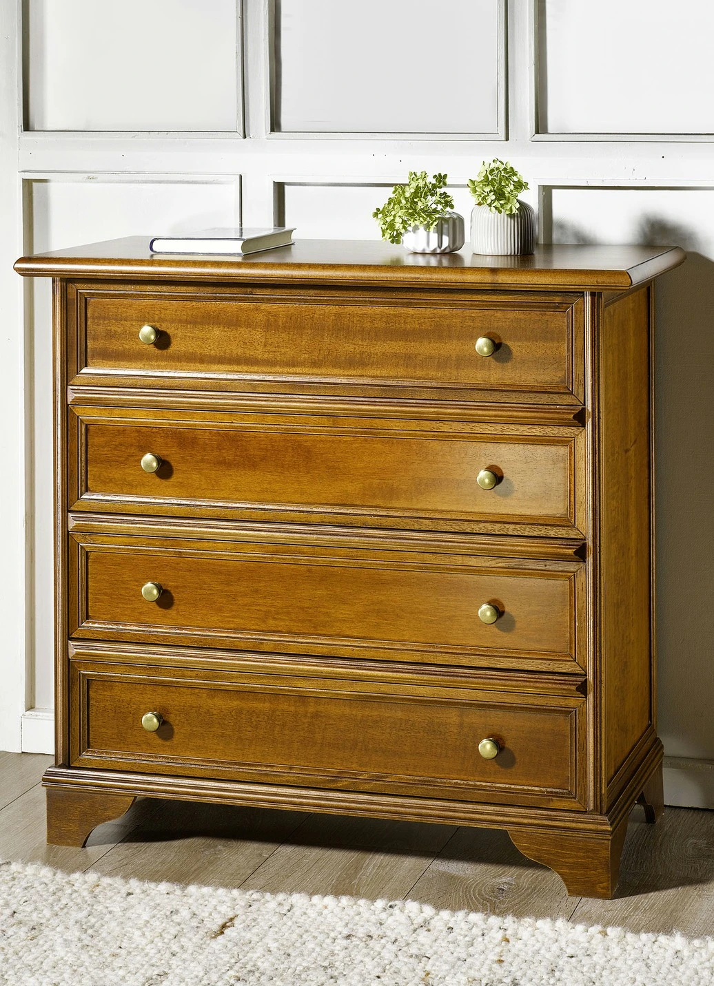 Kommodenserie mit messingfarbenen Metallknöpfen in der Ausführung Schubladenkommode, groß und in Nussbaum.