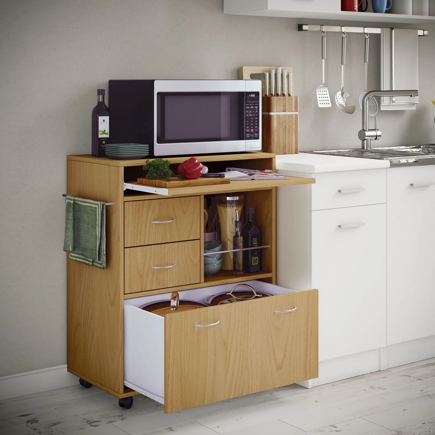 Dieser super praktische und sehr geräumige Küchenrollwagen in Holzstruktur-Nachbildung mit pflegeleichter Melaminbeschichtung sorgt für ausreichend Stauraum in Ihrer Küche. Mit großer, ausziehbarer Arbeitsfläche, 4 Rollen, silberfarbenen Edelstahlgriffen, 3 Schubladen (2 kleine und 1 große) sowie 1 geräumigen, offenen Fach. Geschirrtuchhalter an der Seite.