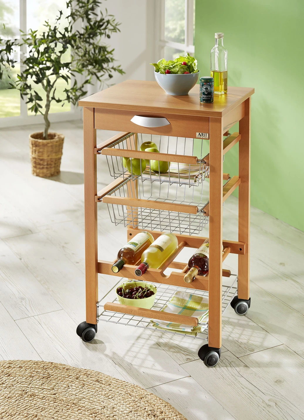Hochwertiger und praktischer Küchenwagen aus massivem Buchenholz mit 3 großen Ablagekörben aus Metall und 1 Flaschenregal mit 1 Flaschenregal mit Platz für 4 Flaschen. Mit Schublade unter der laminierten Arbeitsplatte. Auf 4 leichtgängigen Rollen.