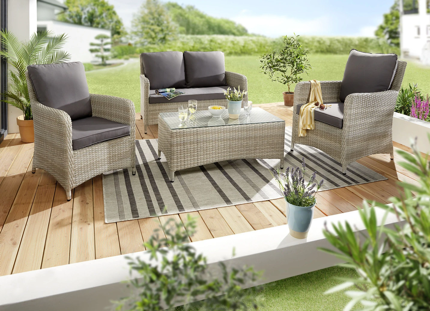 Das auf solides Aluminiumgestell gearbeitete, halbrunde Polyrattan-Kunststoffgeflecht und die bequemen Auflagen machen diese gemütliche, edle Sitzgruppe zu einer runden Sache! Die extra hohen Lehnen und die bequemen Polster (100% PES) schaffen zusätzlichen Sitzkomfort. Perfekt geeignet für Garten, Terrasse oder Wintergarten. Tisch mit Glasplatte.
