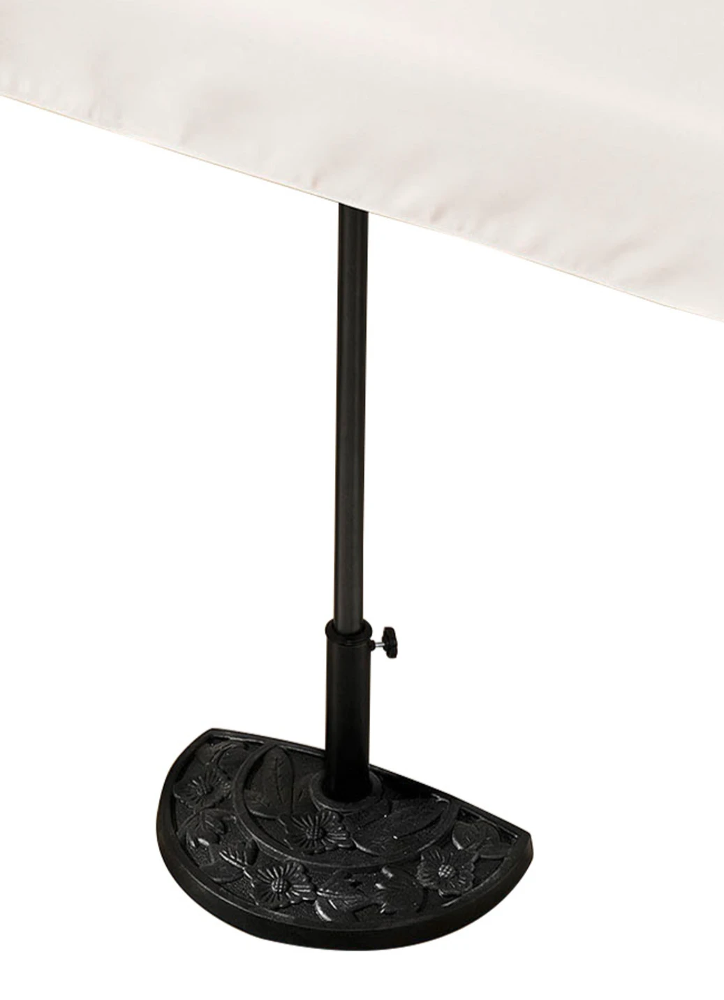 Sonnenschirm-Fuß, halbrund. Massive Qualität in Guss-Optik mit dekorativen Elementen und Schirmaufnahme aus Stahl. Passend für Schirme mit Rohrdurchmesser von 38 bis 48mm. Maße: B49 H31,5 T32cm.