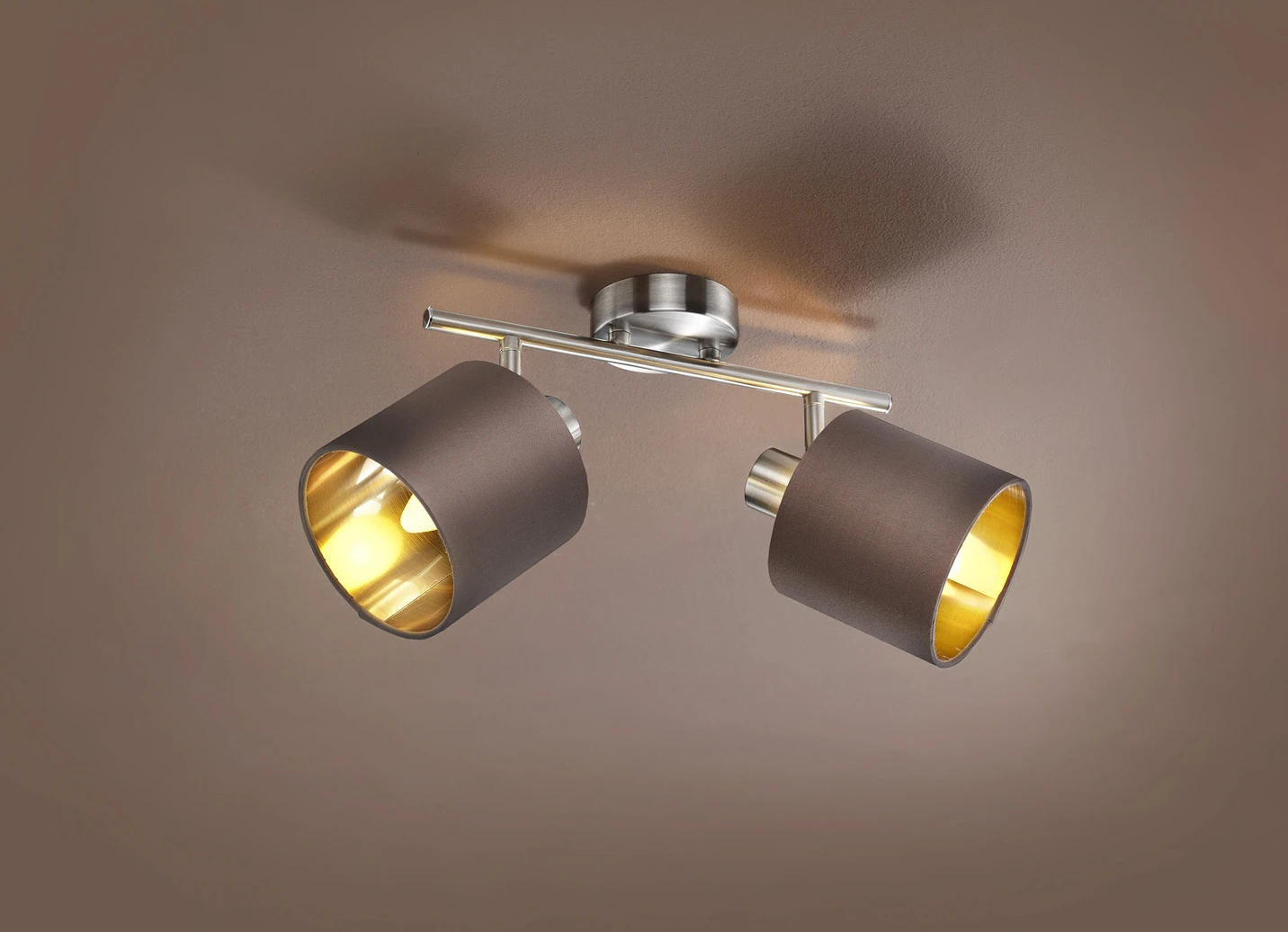 Stilsicher und dezent präsentieren sich diese modernen Deckenleuchten. Aus Stahl, Lampenschirme außen mit braunem Baumwollstoff bezogen und innen goldfarben beschichtet. Jeweils 220–240 Volt, max. 40 Watt. Die Lieferung erfolgt ohne Leuchtmittel. Mit Aufbau-Anleitung.