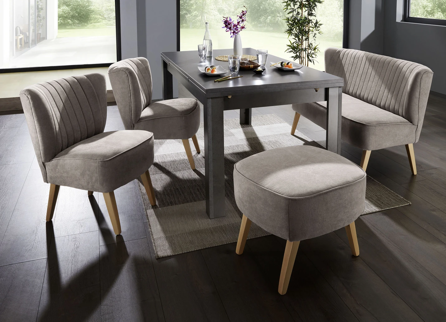 Moderne Esszimmermöbel mit Holzfüßen in Buche in der Ausführung Hocker und in Taupe.