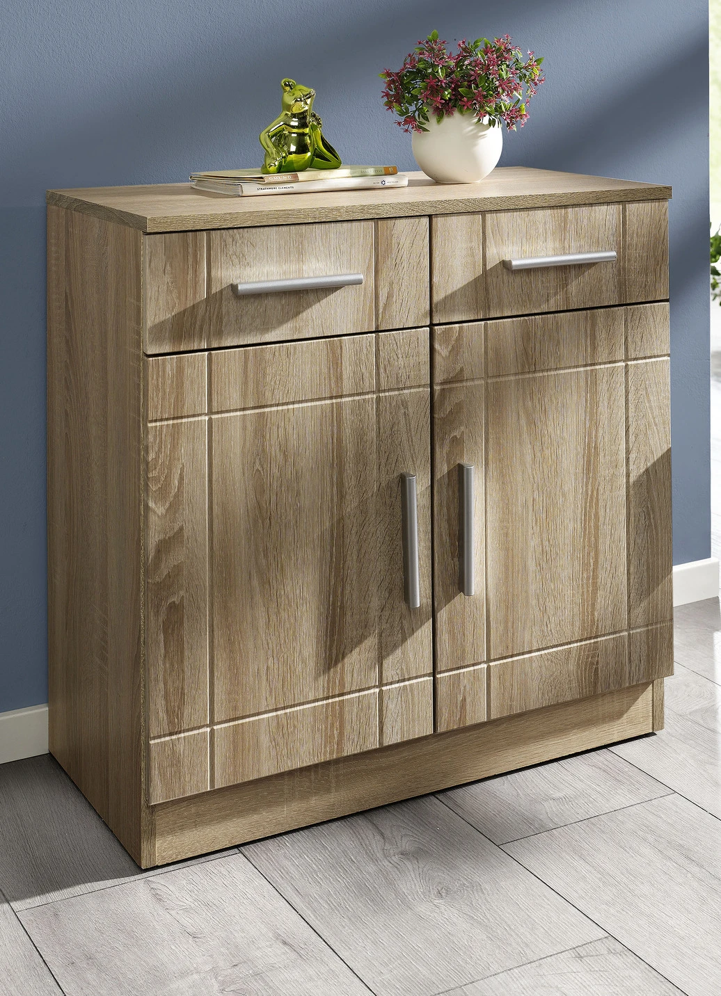 Moderne Kommode mit matten Tiefzieh-Fronten in der Ausführung Kommode, 2-türig und in Weiss Eiche Sonoma.
